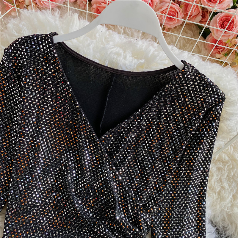 Cheap Blouses & Shirts, Buy Quality Women’s Clothing Directly from China Suppliers:Black/Gold Bling Blouse Women Sexy V Neck Flare Long Sleeve Bandage Shirt Female Slim Vintage Tops Elegant Blusas Spring Autumn