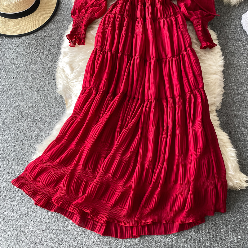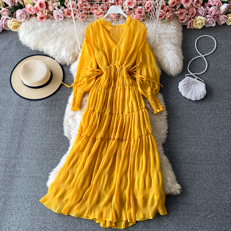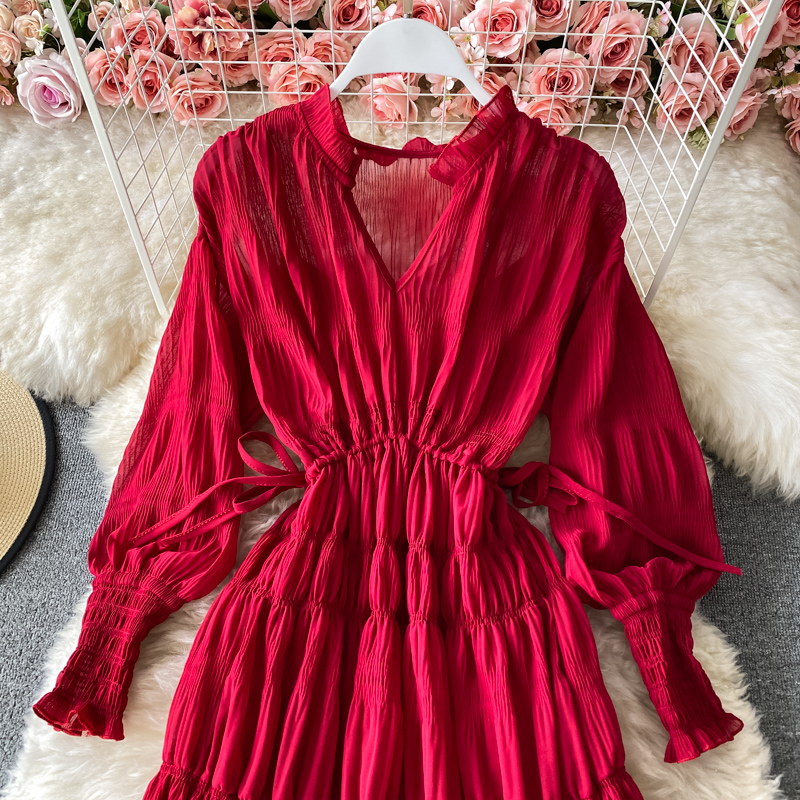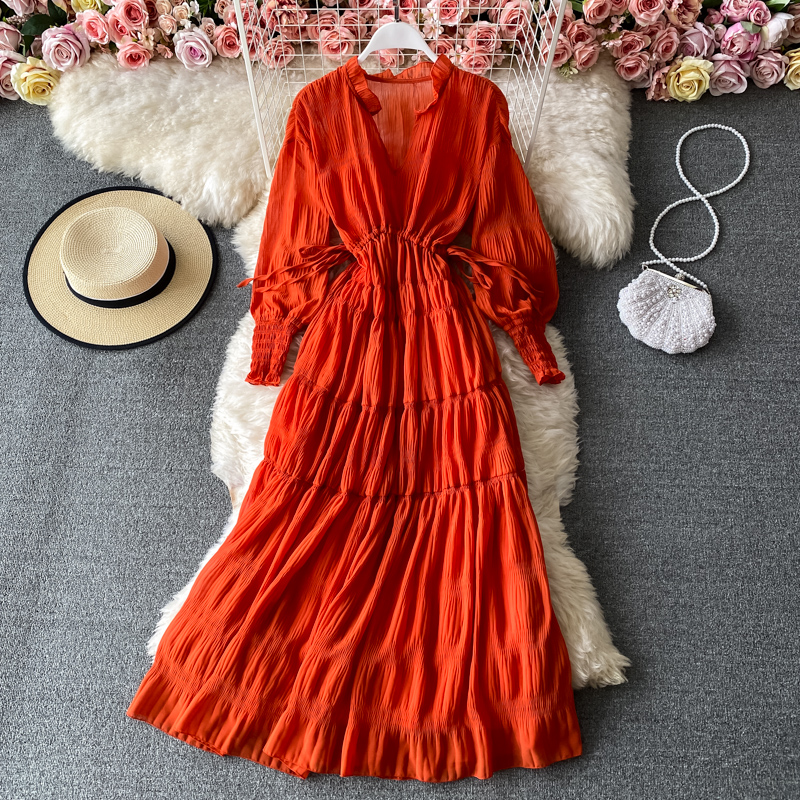 Vintage Red/Orange/Beige Chiffon Dress Women Elegant V-Neck Lantern Long Sleeve High Waist Party Beach Vestido Female Spring New