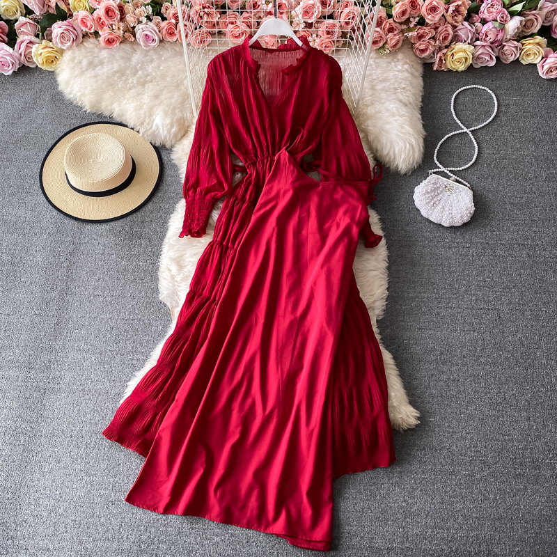 Cheap Dresses, Buy Quality Women’s Clothing Directly from China Suppliers:Vintage Red/Orange/Beige Chiffon Dress Women Elegant V Neck Lantern Long Sleeve High Waist Party Beach Vestido Female Spring New