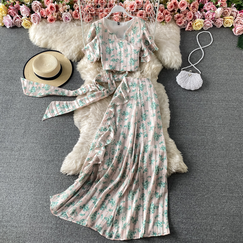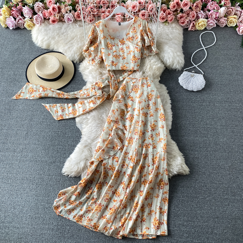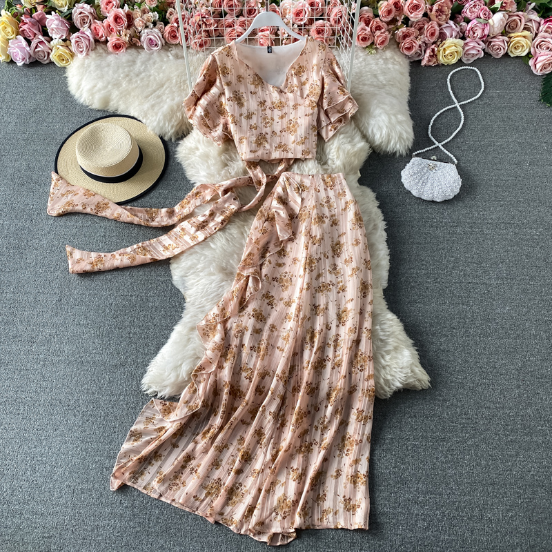 Bohemian Women 2pcs Set Spring Summer Sexy V-Neck Short Sleeve Bandage Tops + High Waist Ruffle Long Skirt Fashion Suit New