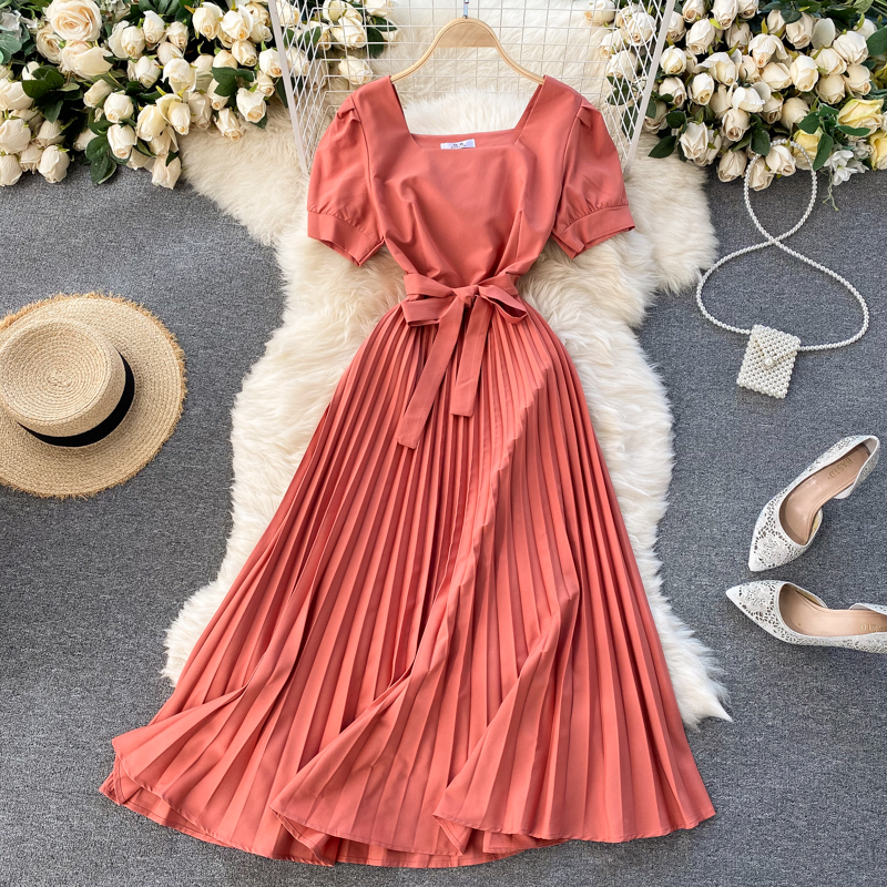 Vintage Square Collar Pleated Dress Women Spring Summer New Fashion Yellow/Blue/Red High Waist Bandage Party Vestidos Robe
