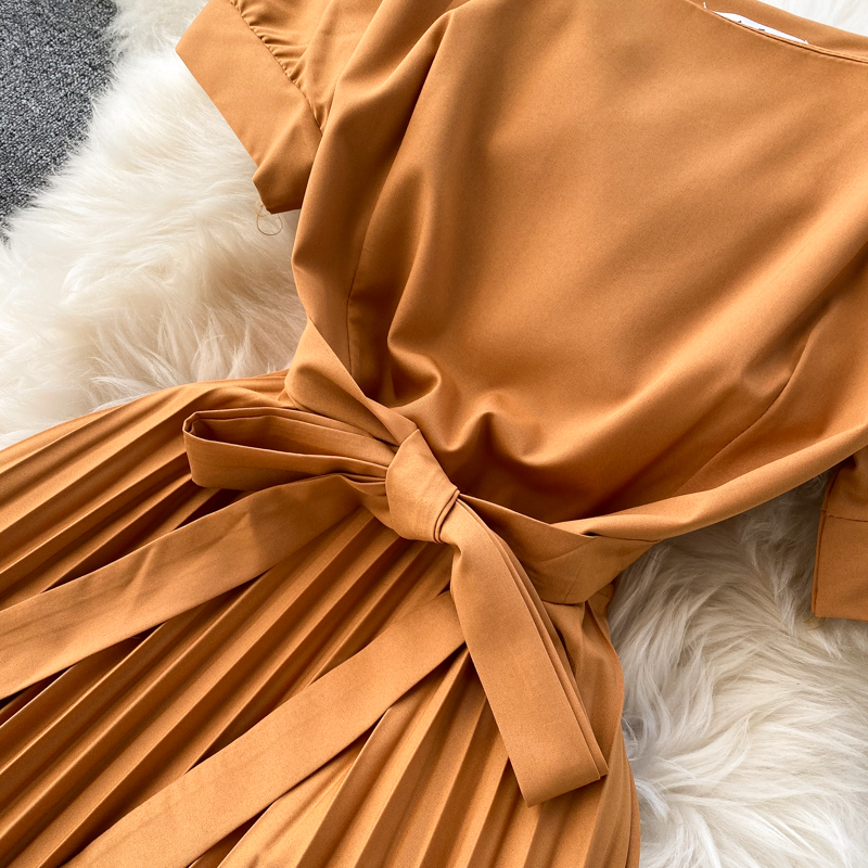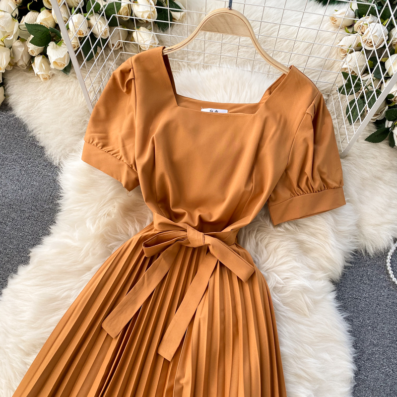 Cheap Dresses, Buy Quality Women’s Clothing Directly from China Suppliers:Vintage Square Collar Pleated Dress Women Spring Summer New Fashion Yellow/Blue/Red High Waist Bandage Party Vestidos Robe