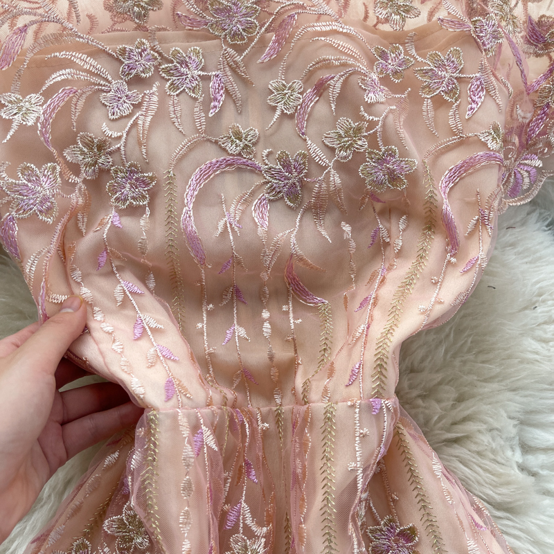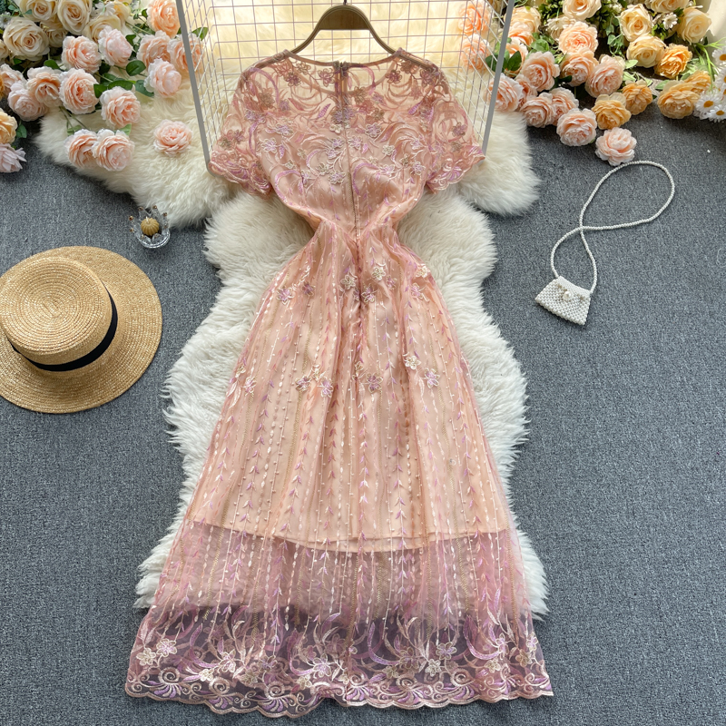 Sweet Pink Embroidered Dress Women Elegant See Through High Waist Short Sleeve Party Vestidos Female Summer Fashion Robe