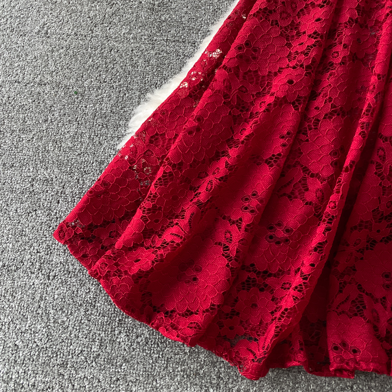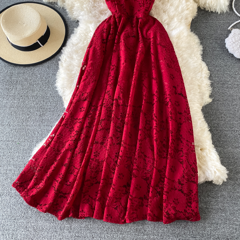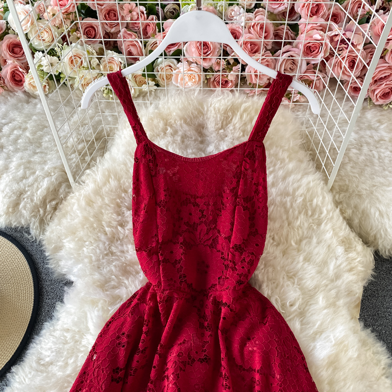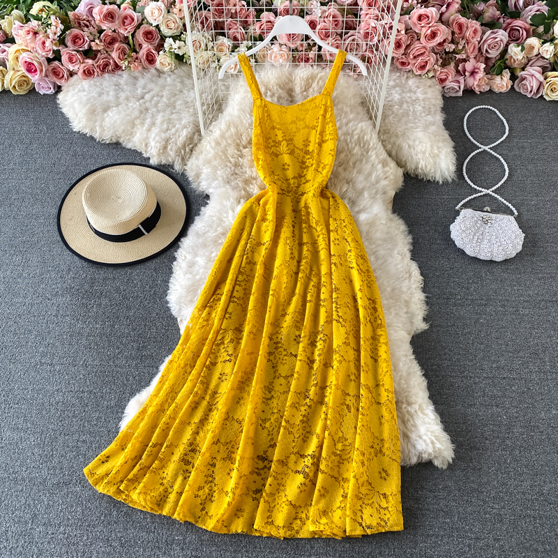 Vintage Spaghetti Strap Lace Midi Dress Women Sexy Red/Pink/Yellow Open Back High Waist Vestidos Female Summer New Fashion
