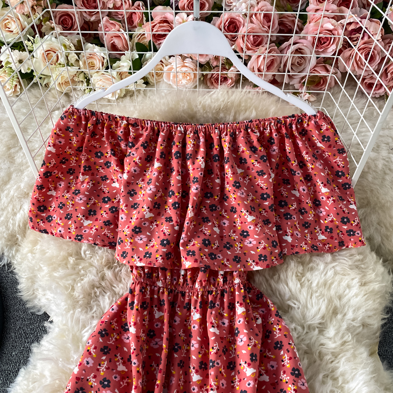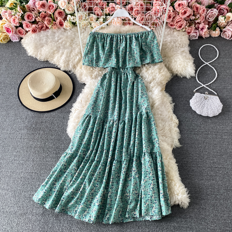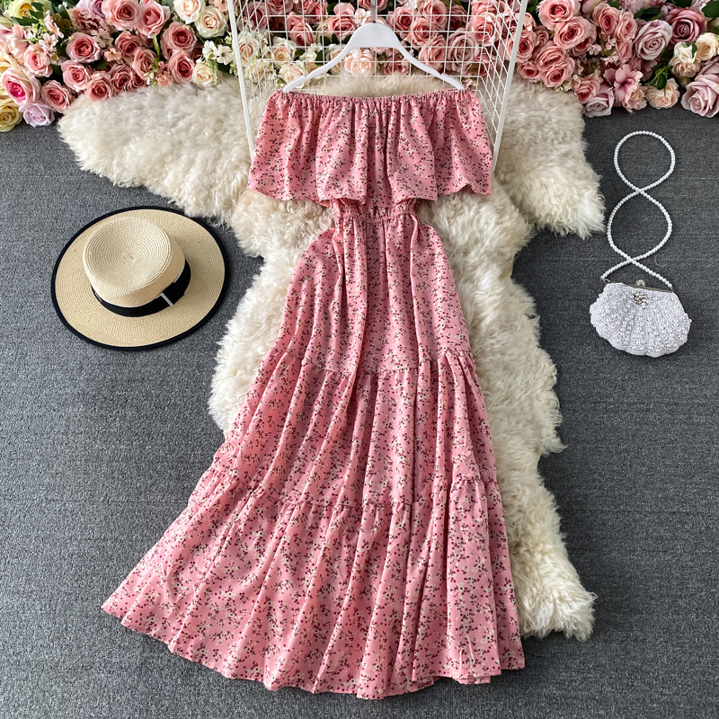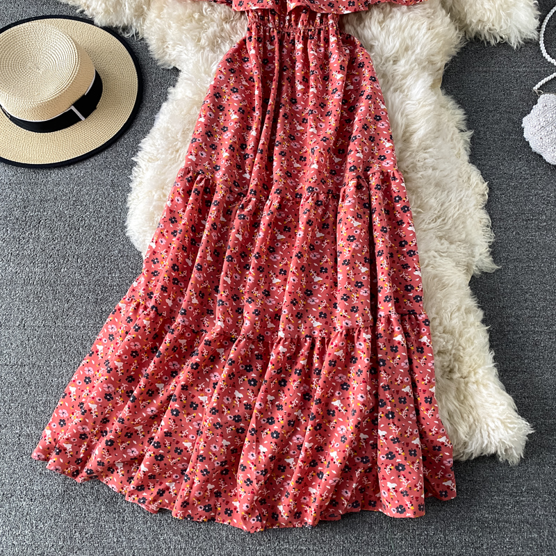 Sexy Slash Neck Midi Dress Women Bohemian Floral Printed Robe Female Ruffle Big Swing Chiffon Vestidos Female New Fashion