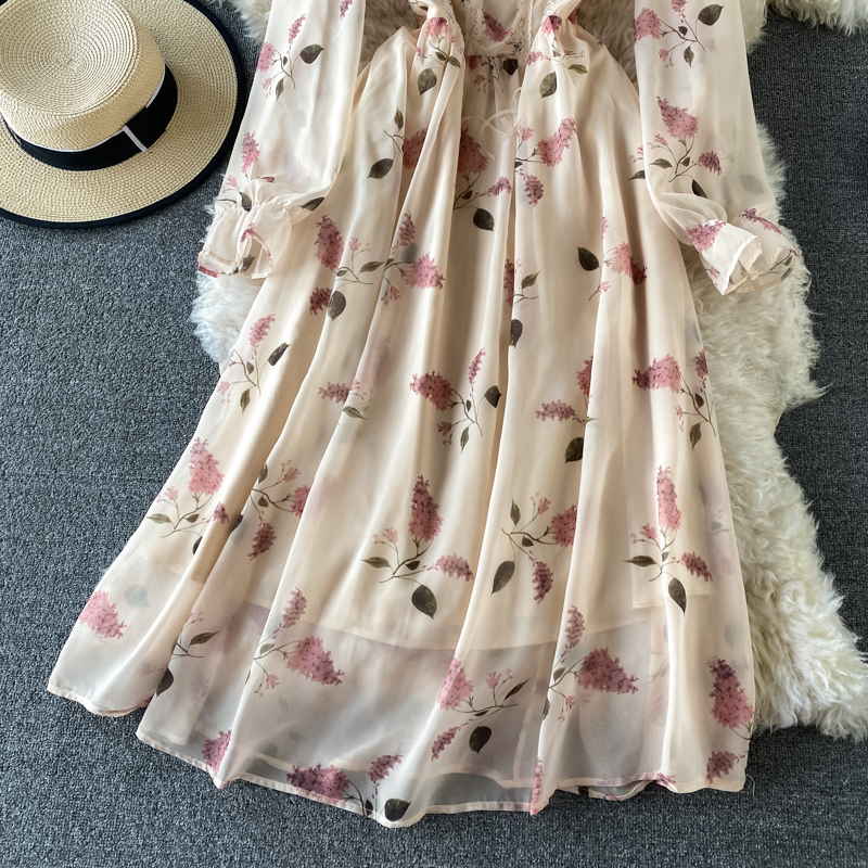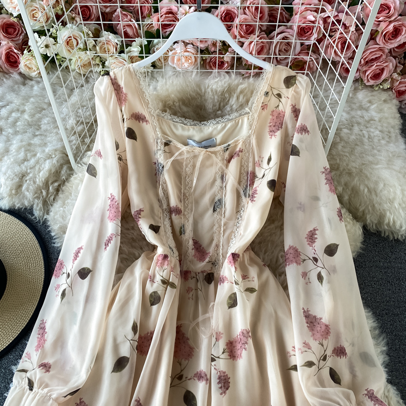 Sweet Square Collar Lace Chiffon Printed Midi Dress Women Elegant Flare Long Sleeve High Waist Vestidos Bohemian Spring New