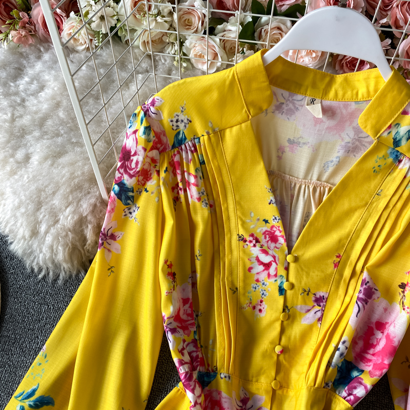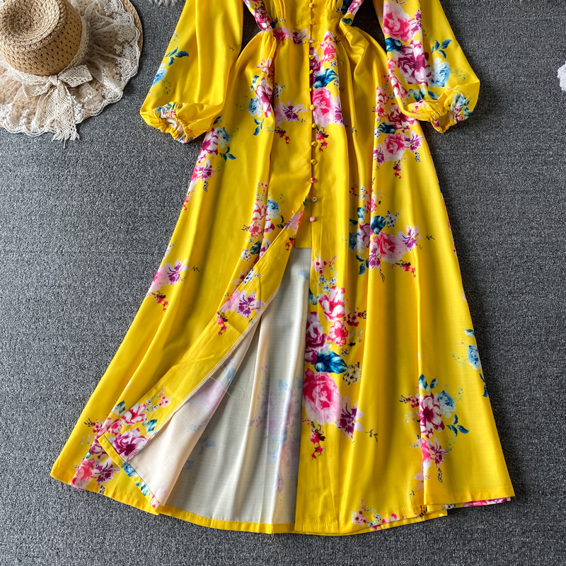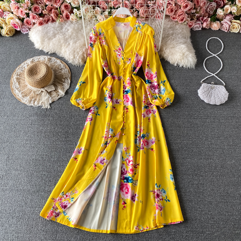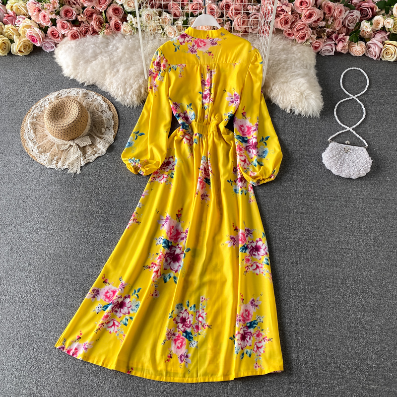 Bohemian Women Floral Printed Long Dress Vintage Bohemian Lantern Long Sleeve Big Swing Vestidos Female Vacation Beach New