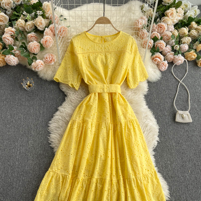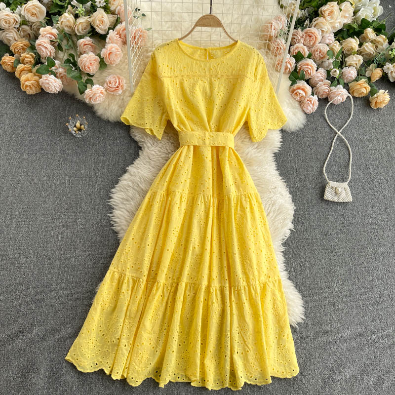 Cheap Dresses, Buy Quality Women’s Clothing Directly from China Suppliers:Purple/Blue/Yellow Hollow Out Embroidery Midi Dress Women Vintage Round Neck Short Sleeve High Waist Vestidos Vacation Beach New