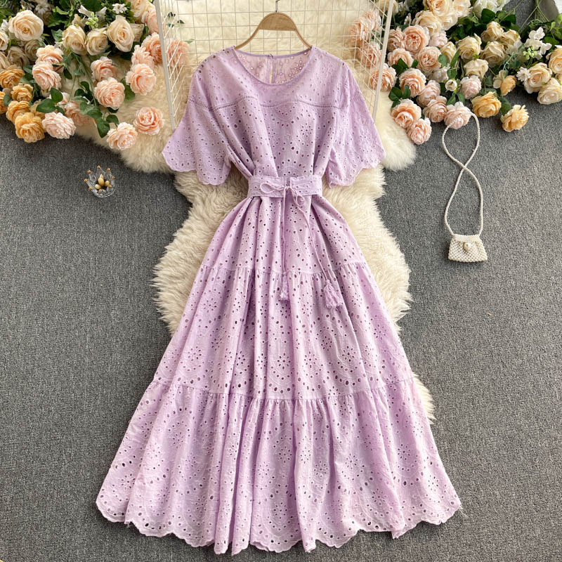 Purple/Blue/Yellow Hollow Out Embroidery Midi Dress Women Vintage Round Neck Short Sleeve High Waist Vestidos Vacation Beach New