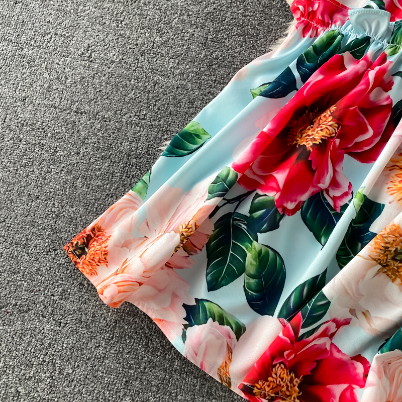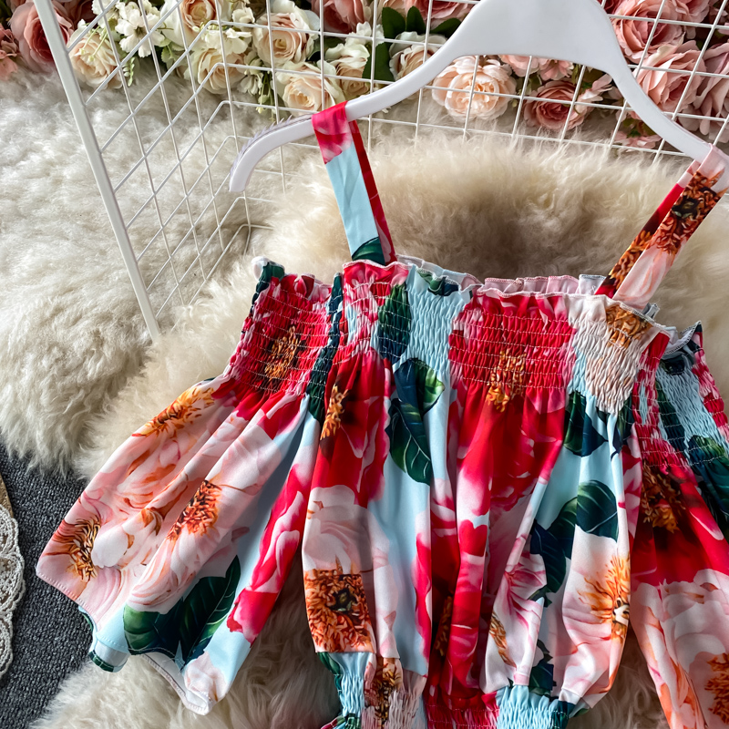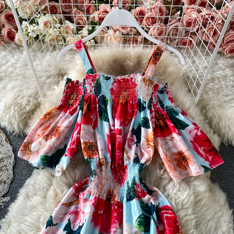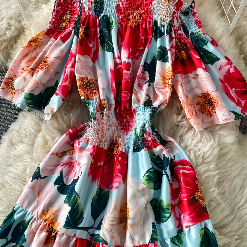Summer Bohemian Printed Spaghetti Strap Dress Women Sexy Slash Neck Big Swing High Waist Short Sleeve A-Line Vestidos New
