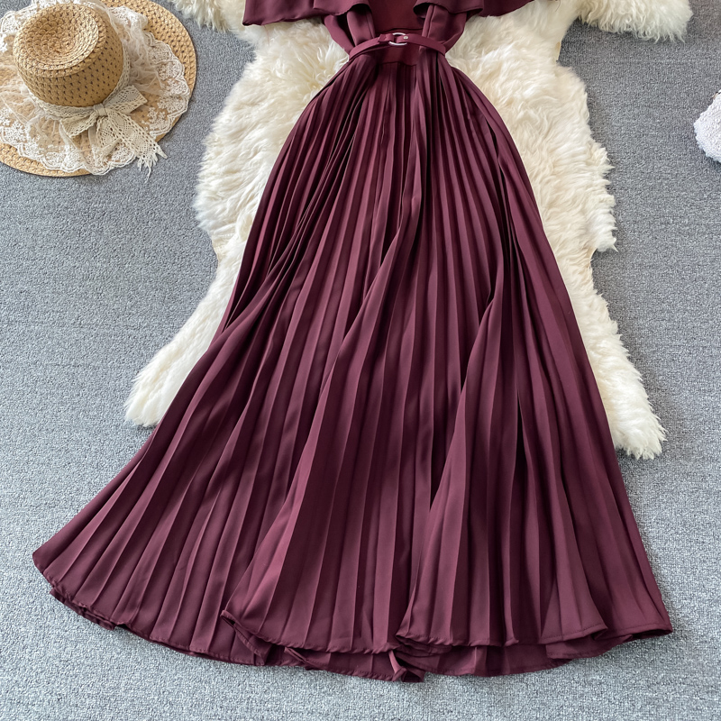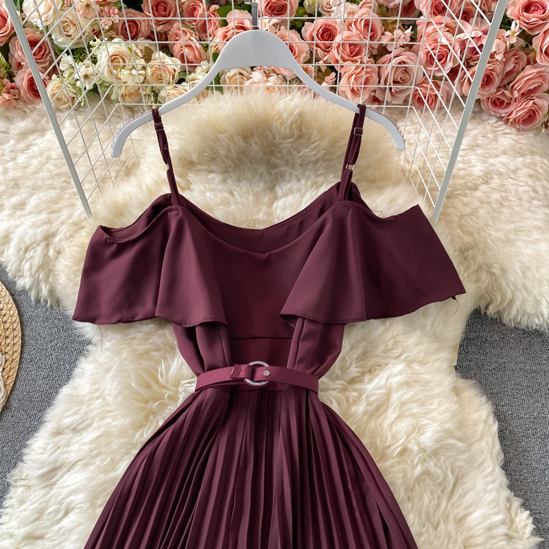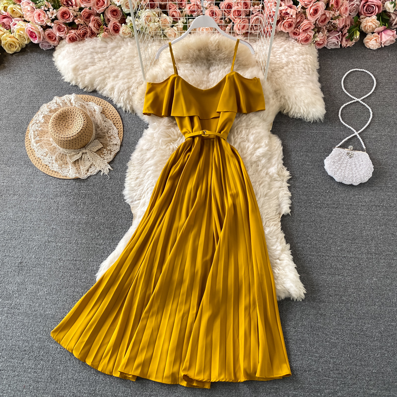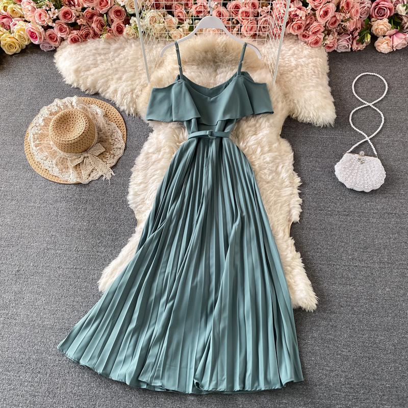 Summer Vintage Green/Beige/Purple Spaghetti Strap Pleated Long Dress Women Casual Off Shoulder Beach Party Vestidos New