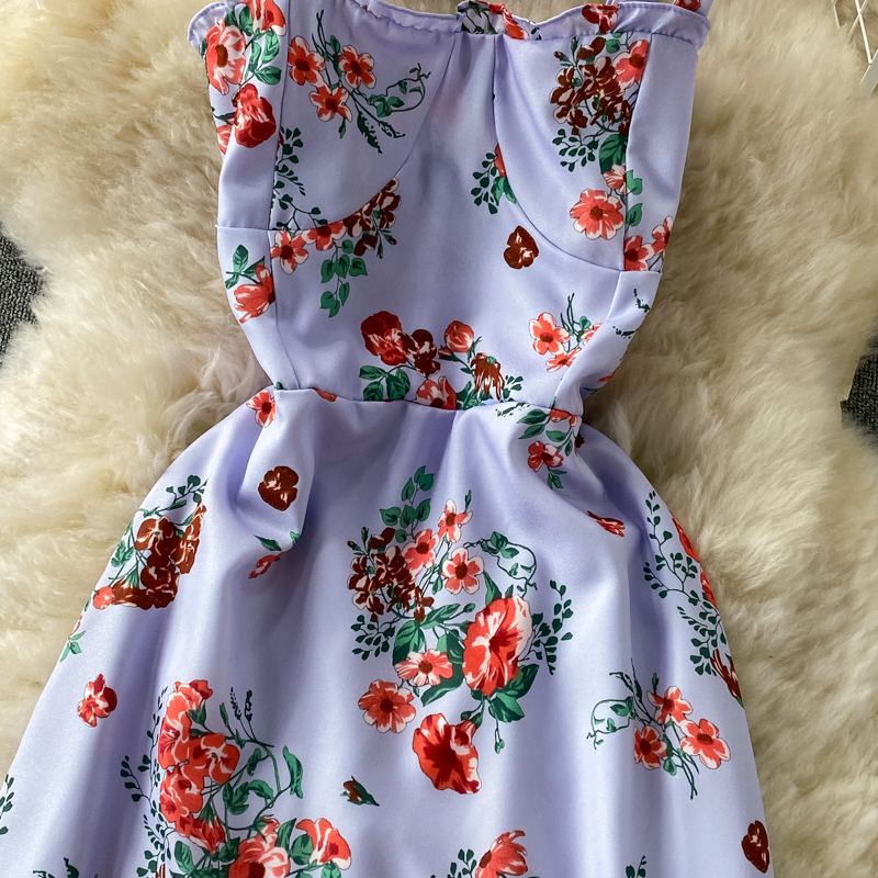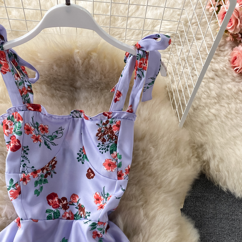 Summer Vintage Women Floral Printed Spaghetti Strap Dress Purple/White/Blue Ruffle Vestidos Female Vacation Beach Robe New