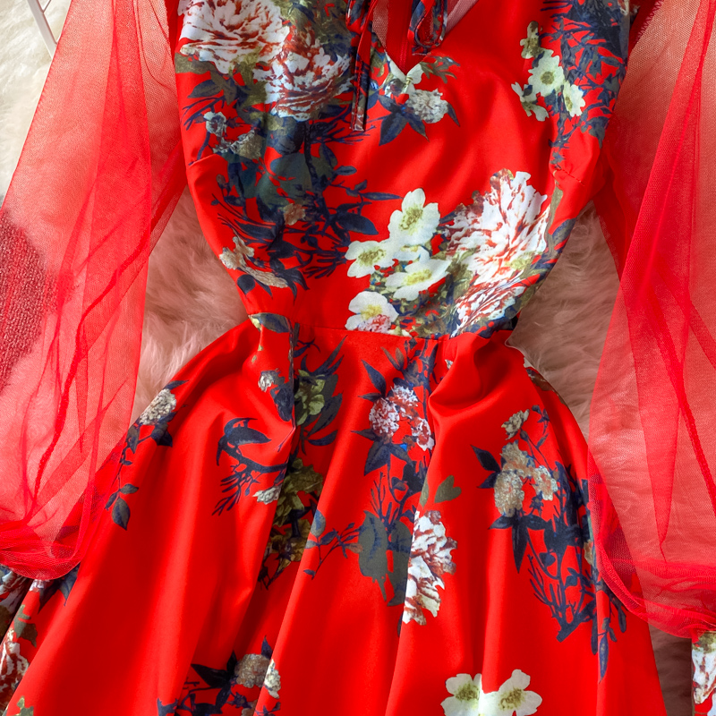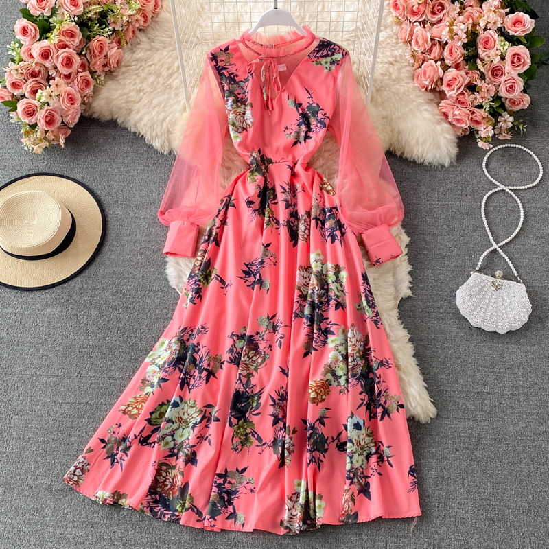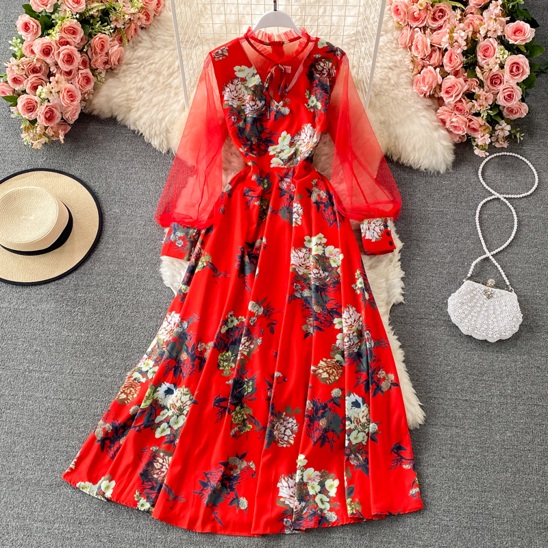 Bohemian Red/Yellow/Pink Floral Long Dress Women Elegant Mesh Long Sleeve Patchwork Chiffon Vestidos Female Spring Summer