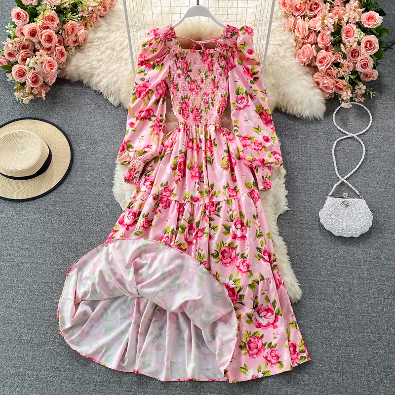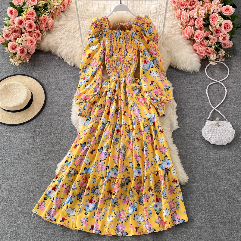 Spring Autumn Bohemian Vacation Beach Long Dress Women Elegant Square Collar Lantern Long Sleeve A-Line Vestidos Casual Robe New
