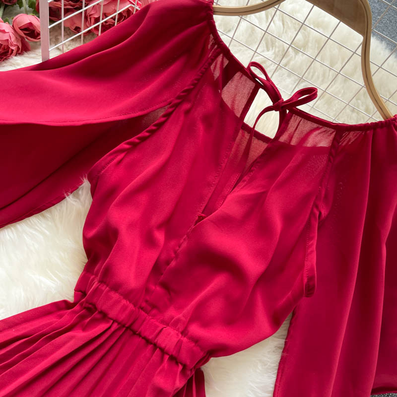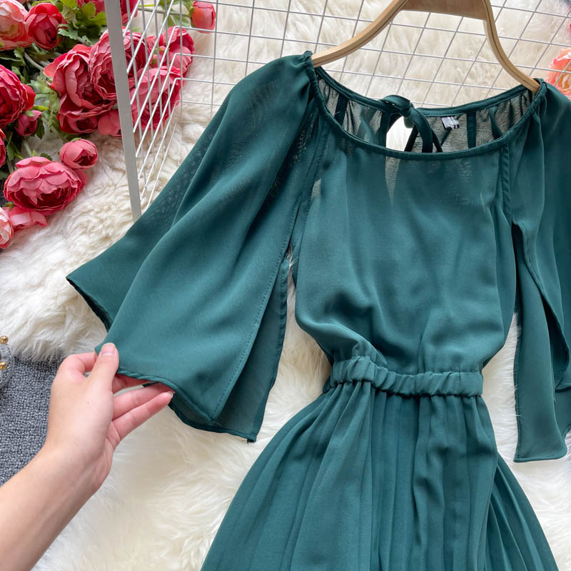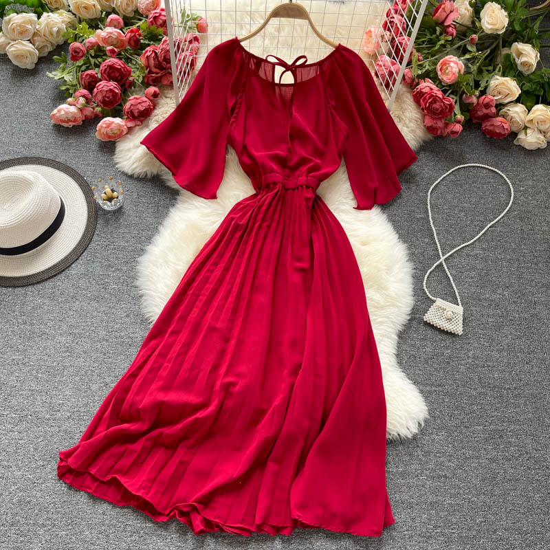 Vintage Women Chiffon Pleated Dress Summer Round Neck Short Sleeve High Waist Green/Red/Purple Draped Vestidos Female New