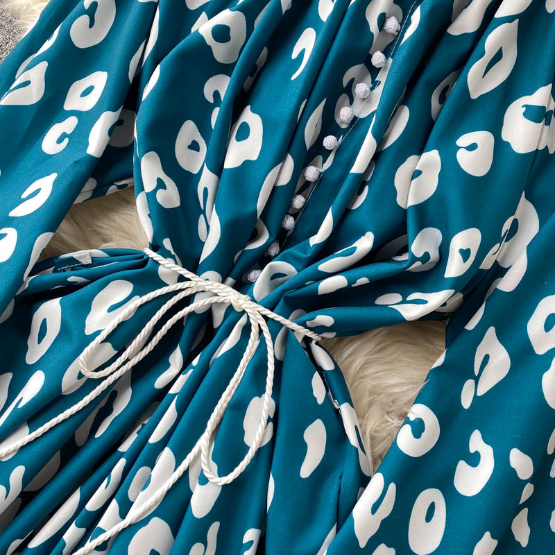 Bohemian Blue Printed Midi Dress Women Elegant Stand Collar Long Sleeve High Waist Single Breasted A-Line Vestidos Spring Fall