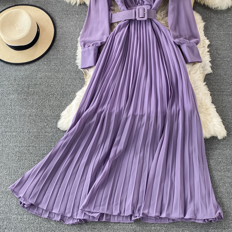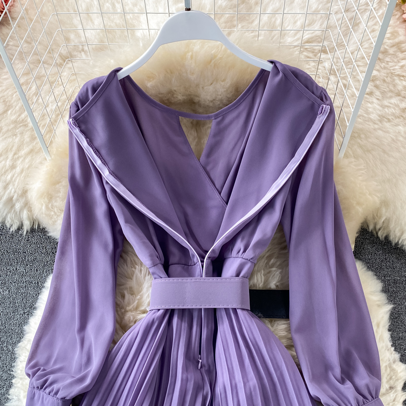 Women Purple/Red Hollow Out Pleated Long Dress Vintage Round Neck High Waist Draped Maxi Vestidos Female Spring Summer New