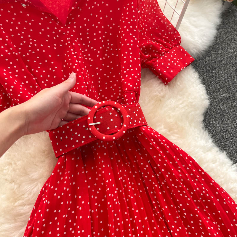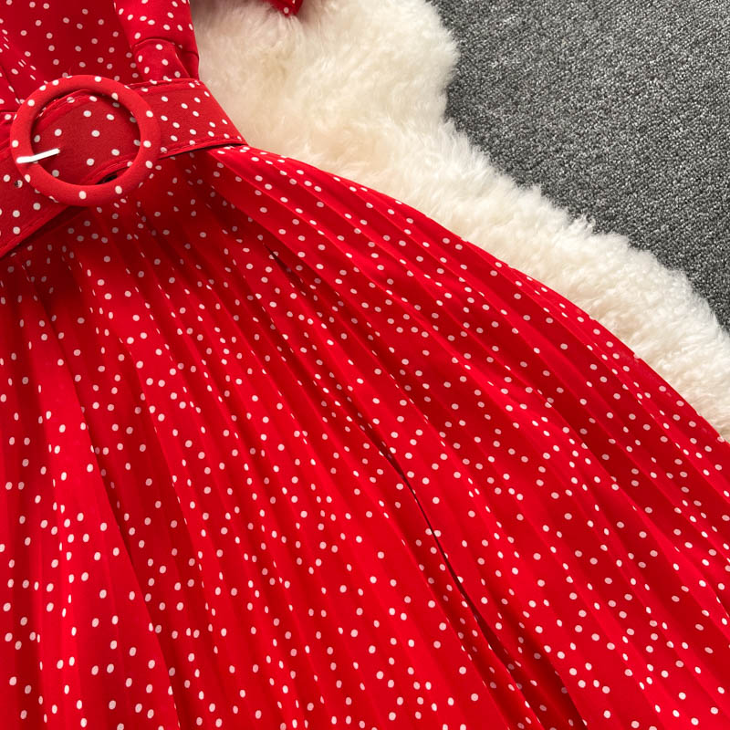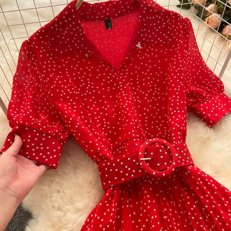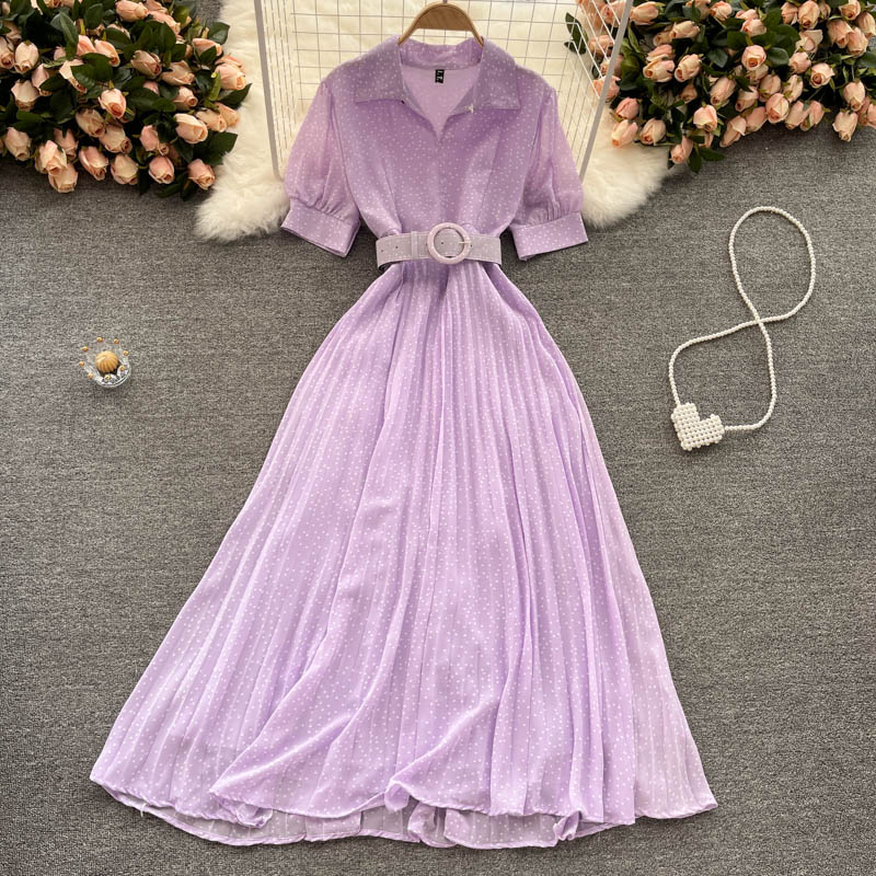 Summer Sweet Purple/Pink/Yellow Polka Dot Chiffon Long Dress Women Elegant Turn-Down Collar Short Sleeve Pleated Vestidos Sashes