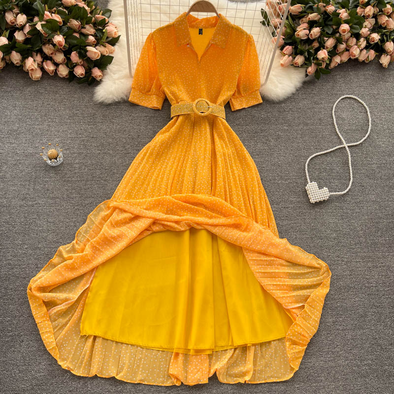 Cheap Dresses, Buy Quality Women’s Clothing Directly from China Suppliers:Summer Sweet Purple/Pink/Yellow Polka Dot Chiffon Long Dress Women Elegant Turn Down Collar Short Sleeve Pleated Vestidos Sashes