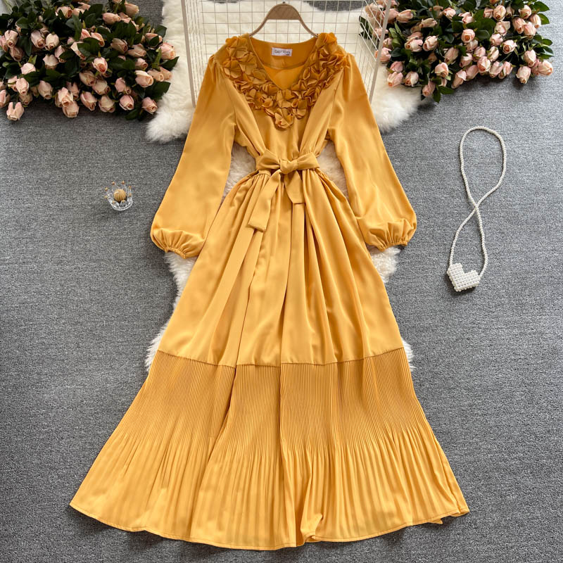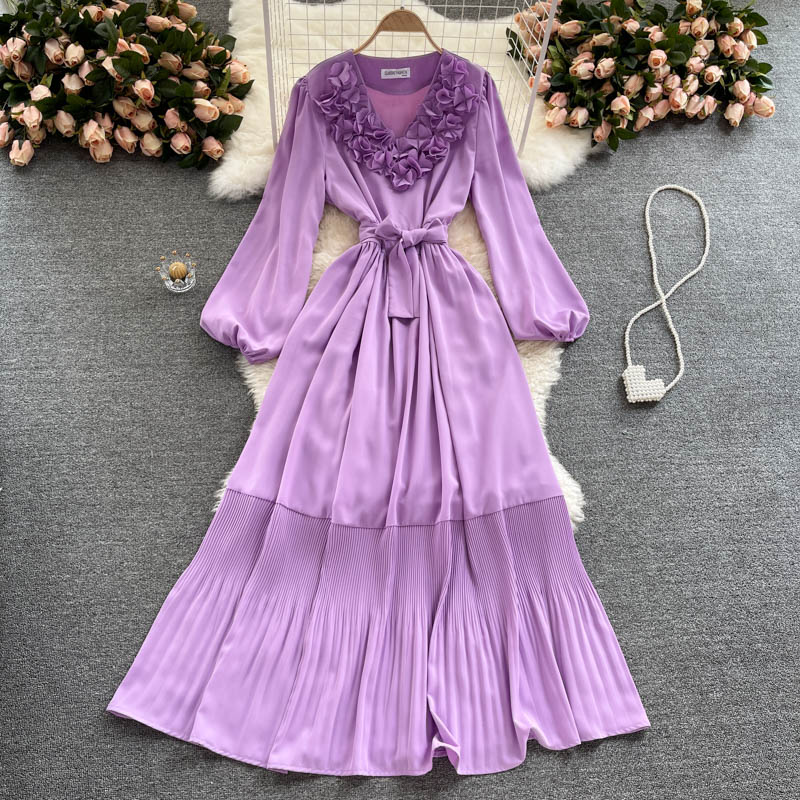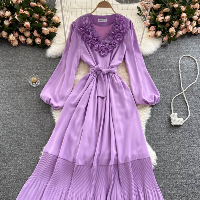 Cheap Dresses, Buy Quality Women’s Clothing Directly from China Suppliers:Vintage Purple/Pink/Yellow Long Dress Women Elegant 3D Flower Puff Sleeve Draped Vestidos Female Pleated Robe Spring Autumn