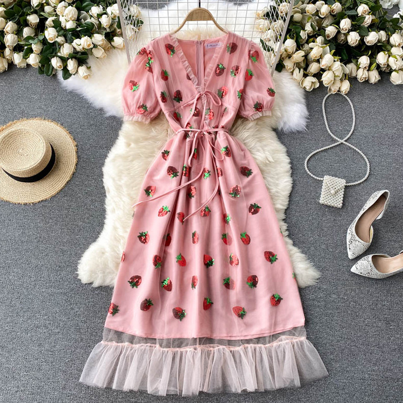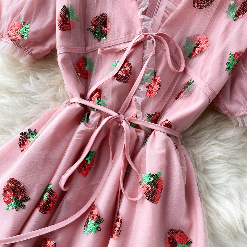 Cheap Dresses, Buy Quality Women’s Clothing Directly from China Suppliers:Women Pink Strawberry Sequin Mesh Long Dress Summer Sweet V Neck Short Puff Sleeve High Waist Vestidos Elegant Female Robe