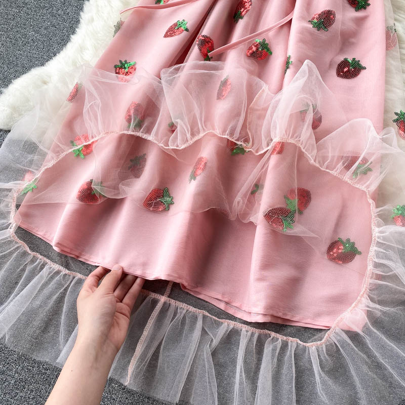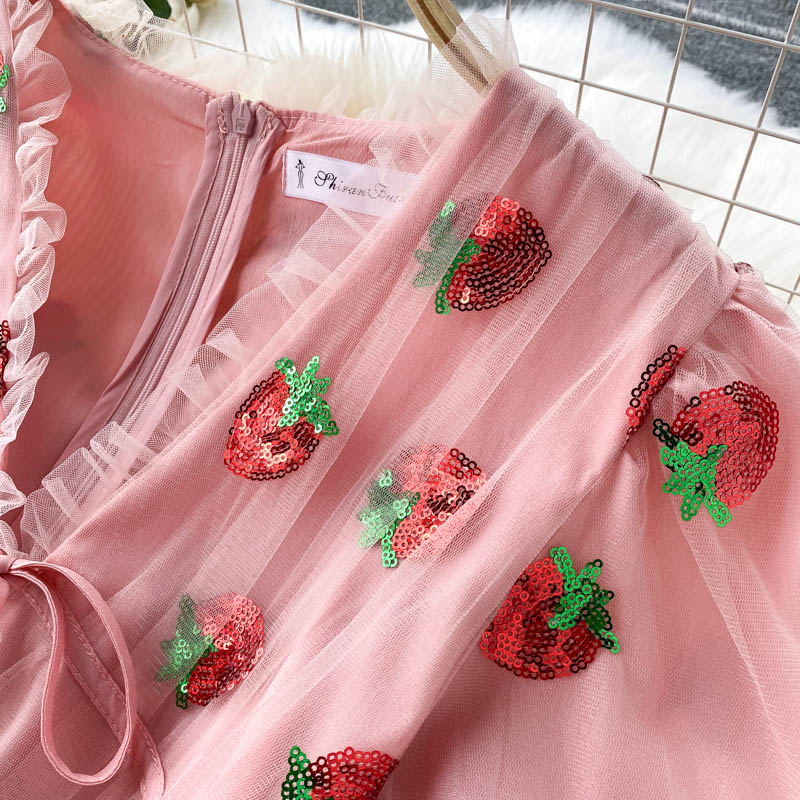 Women Pink Strawberry Sequin Mesh Long Dress Summer Sweet V-Neck Short Puff Sleeve High Waist Vestidos Elegant Female Robe