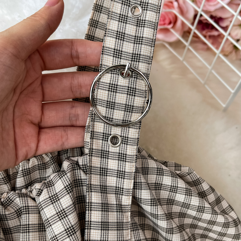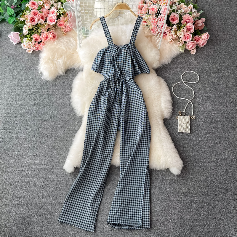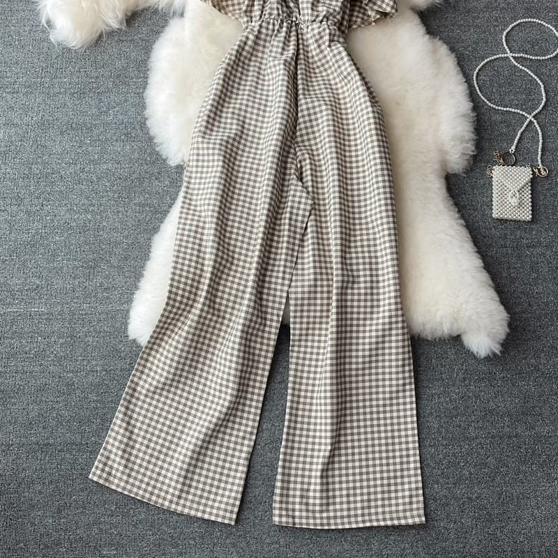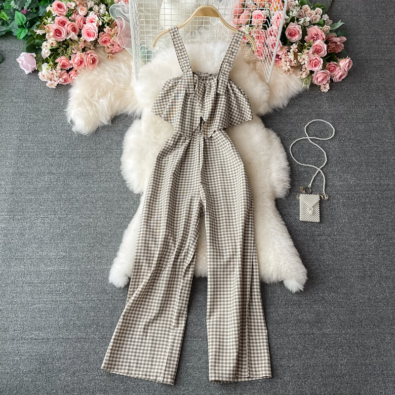 Summer Khaki/Blue/Black Plaid Romper Women Sexy Off Shoulder Ruffle Loose Jumpsuits Female High Waist Wide Leg Playsuit New