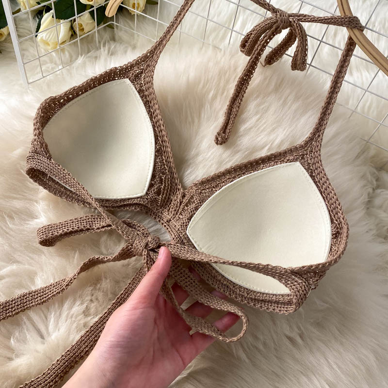 Summer Women White/Black/Khaki Hollow Out Two Piece Set Sexy Knitted Halter Bandage Bikini + High Waist Vacation Beach 2pcs Suit