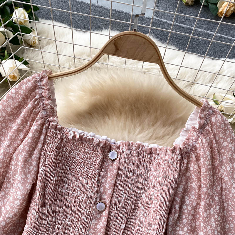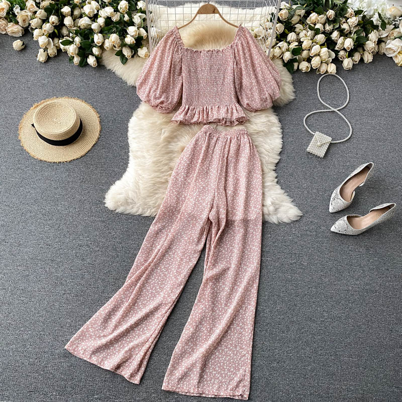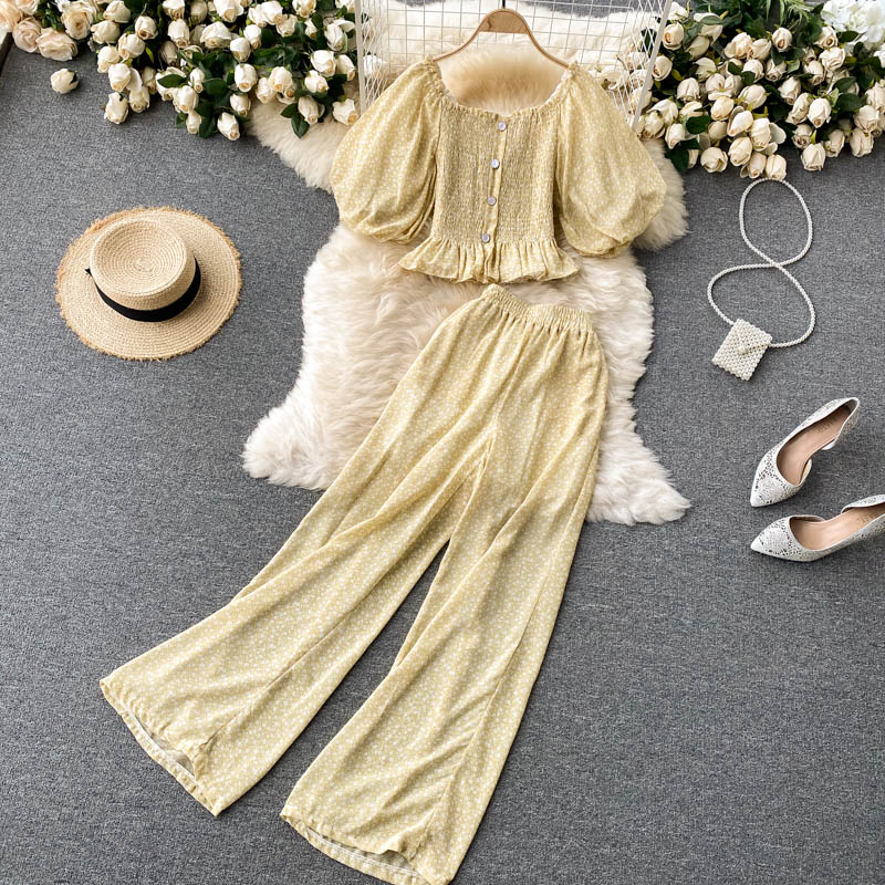 Cheap Pant Suits, Buy Quality Women’s Clothing Directly from China Suppliers:Summer Blue/Yellow/White Printed 2pcs Set Women Vintage Square Collar Puff Sleeve Single Breasted Short Tops And Wide Leg Pants