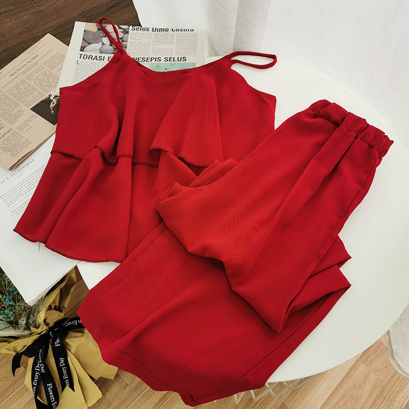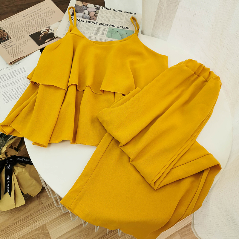 Cheap Pant Suits, Buy Quality Women’s Clothing Directly from China Suppliers:Women Yellow/Red/Black Two Piece Set Sexy Double Layer Ruffle Spaghetti Strap Tops + High Waist Wide Leg Pants Female Suit