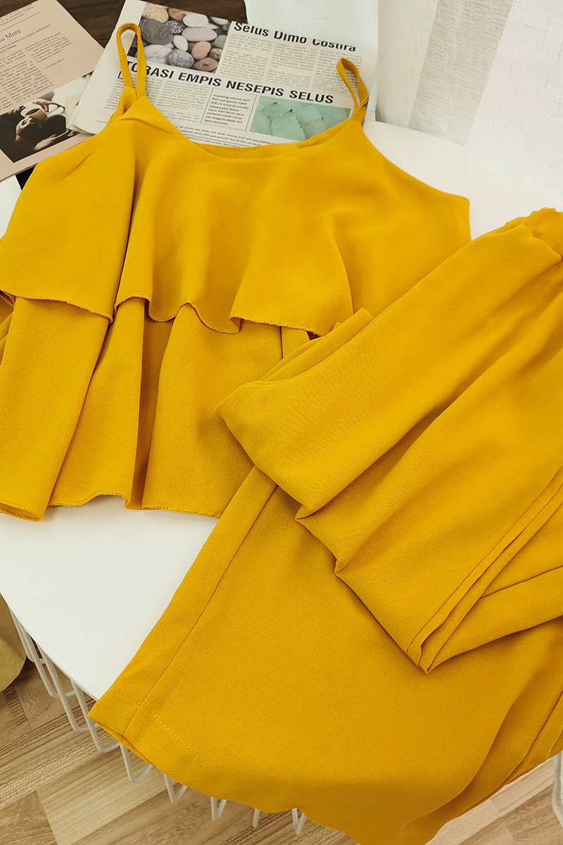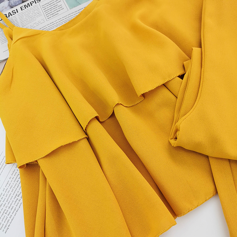 Women Yellow/Red/Black Two Piece Set Sexy Double Layer Ruffle Spaghetti Strap Tops + High Waist Wide Leg Pants Female Suit