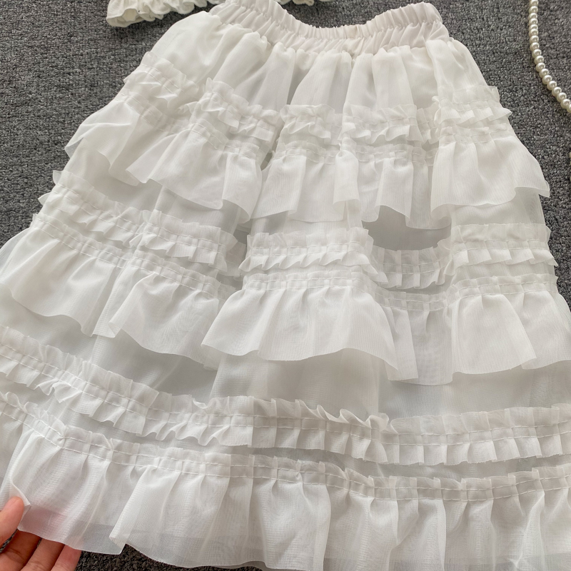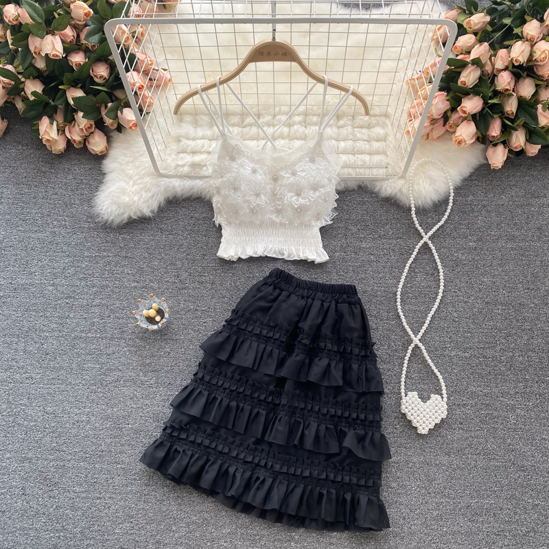 Summer Women Sexy 2pcs Set Club Party Spaghetti Strap Camis Tops + Ruffle Black Mini Skirt Female Two Piece Suit Fashion