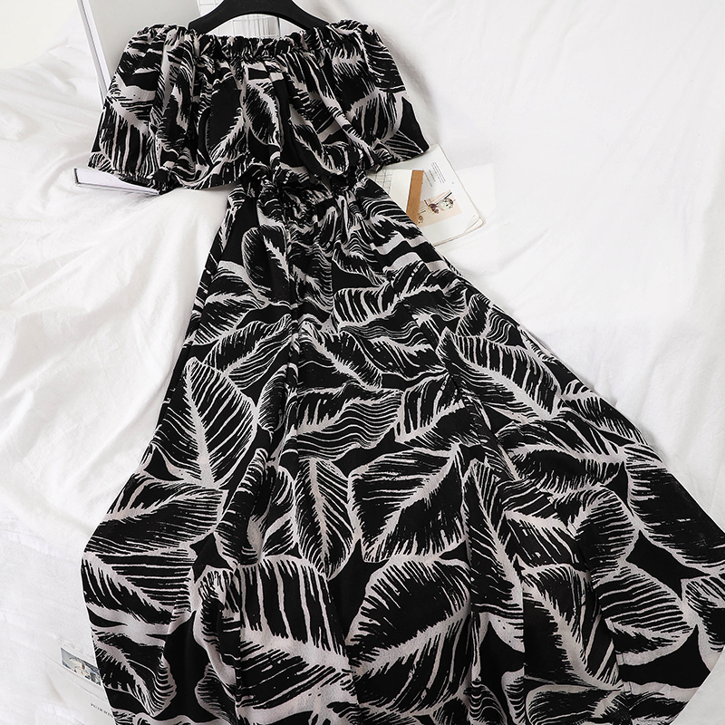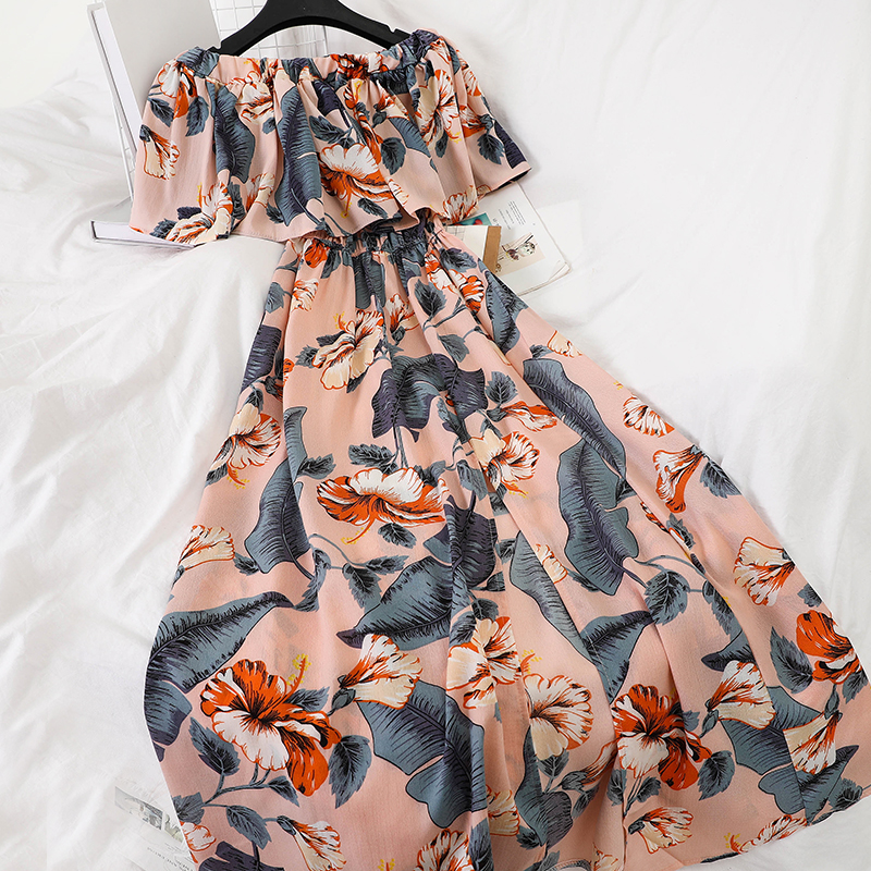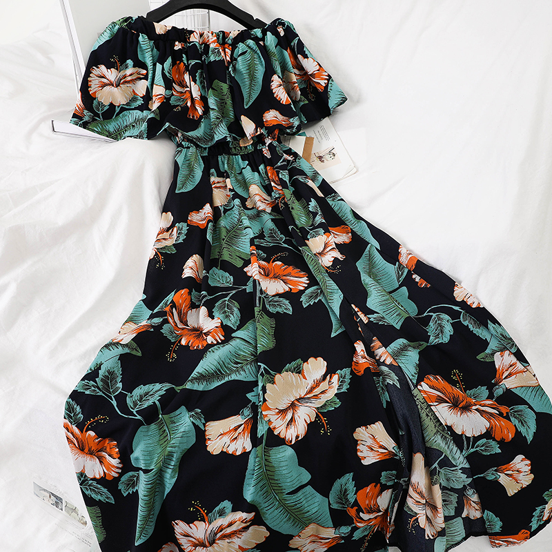 Bohemian Women Green/Pink/Blue Printed Midi Dress Sexy Slash Neck Ruffle High Waist A-Line Sexy Vestidos Summer Female New