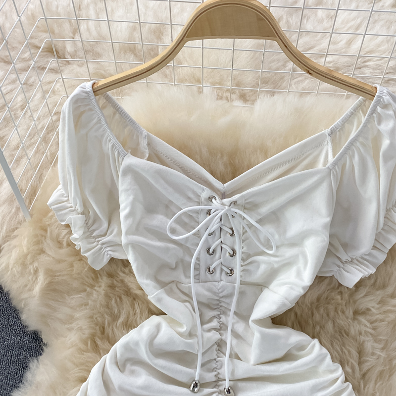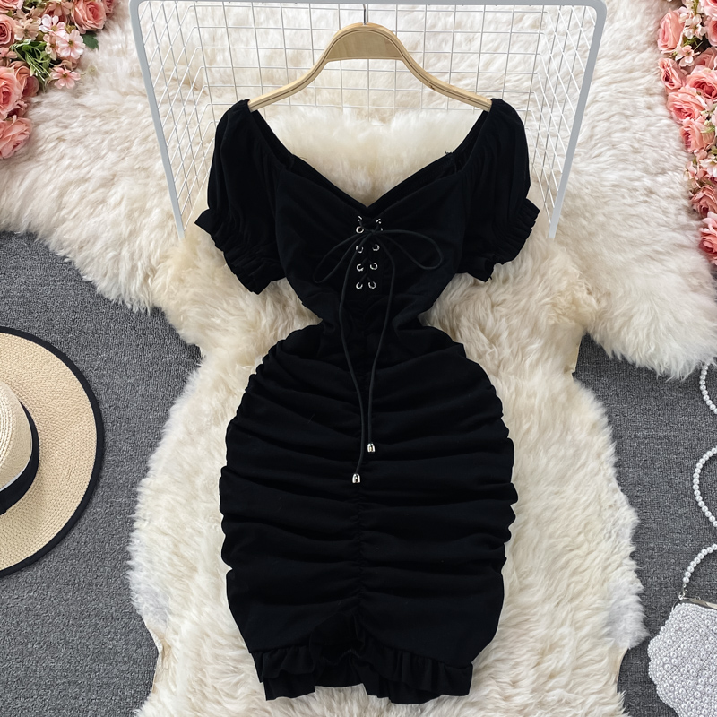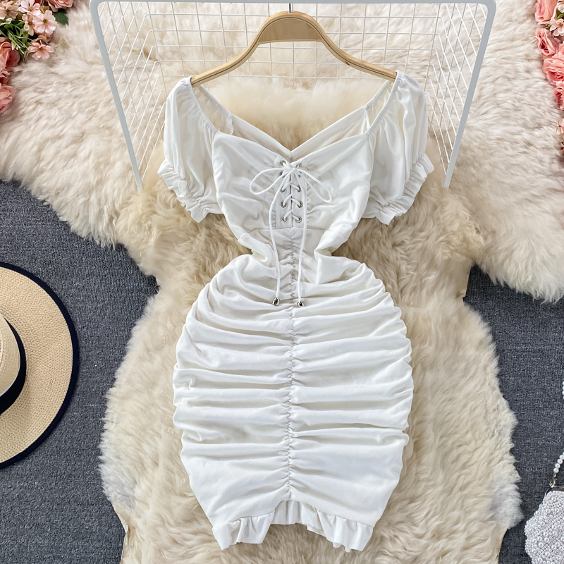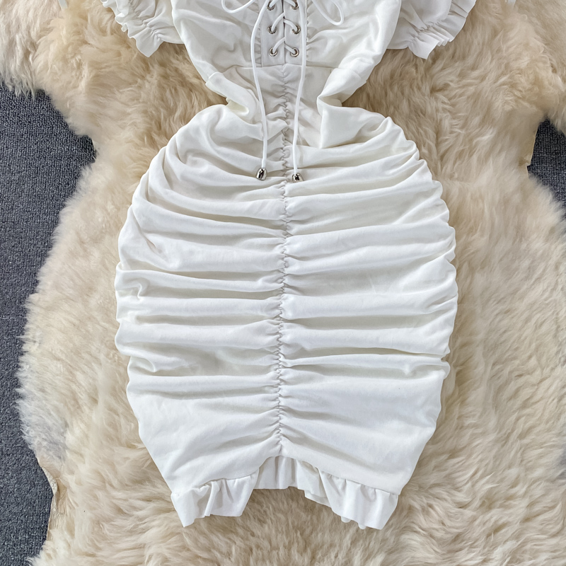 Sexy Drawstring Draped Bodycon Mini Dress Women Black/White Club Party High Waist Short Sleeve Casual Vestidos Female Summer New