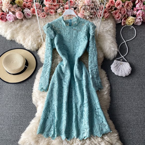 Autumn Winter Pink/White/Beige Hollow Out Party Dress Women Vintage Robe O-Neck Flare Long Sleeve High Waist Vestidos New