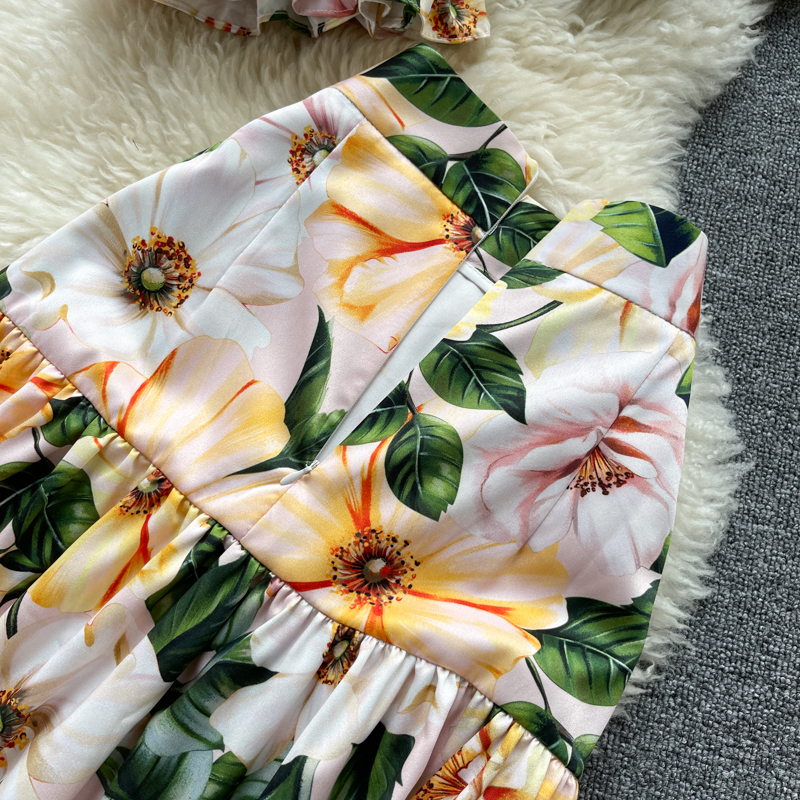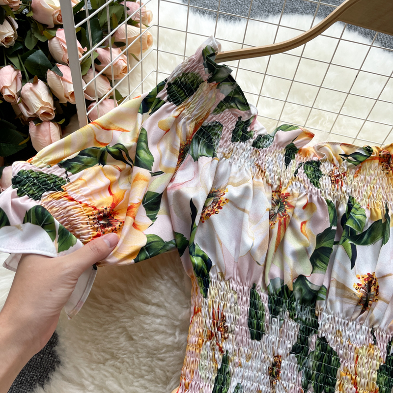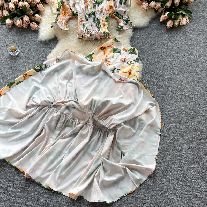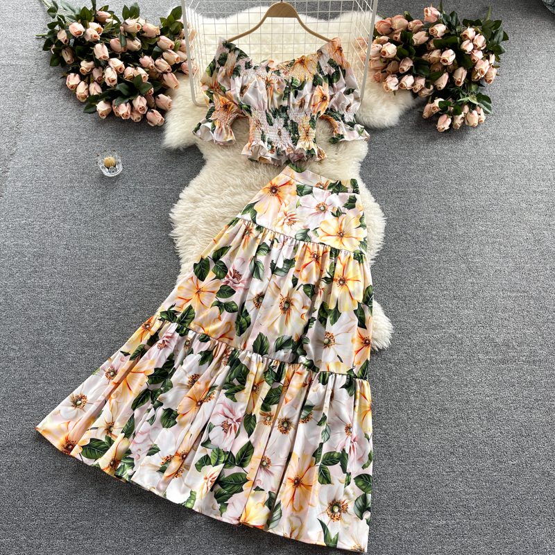Bohemian Summer Women Floral Two Piece Set Sexy Slash Neck Ruffle Short Tops + High Waist A-Line Long Skirt Suit Female New