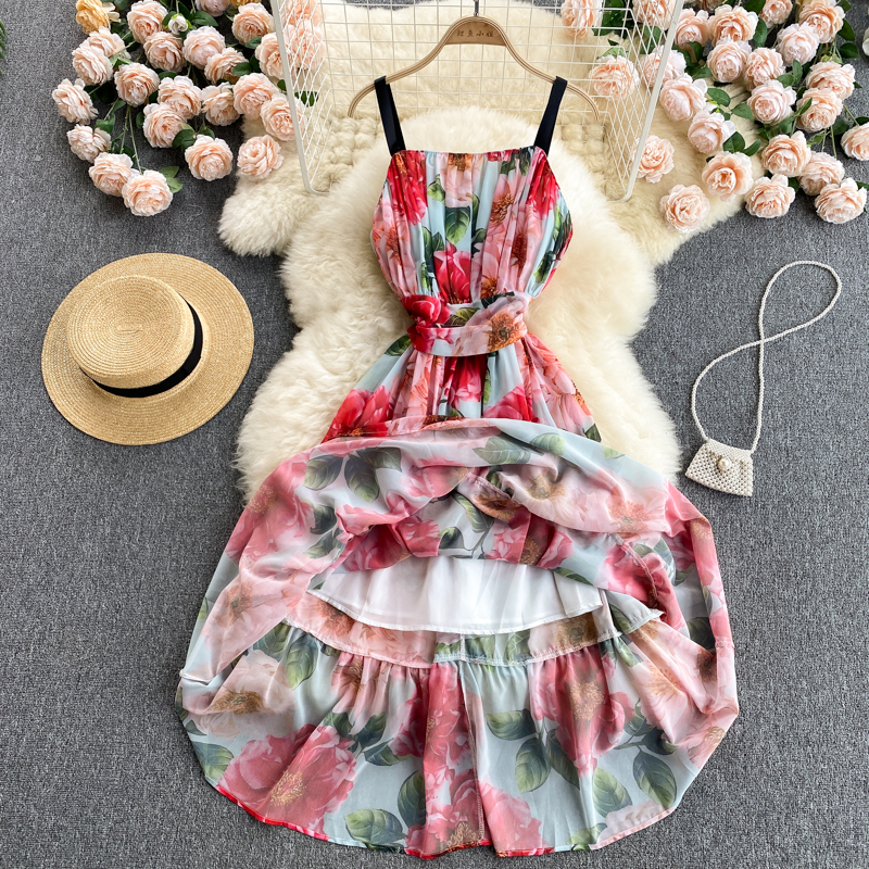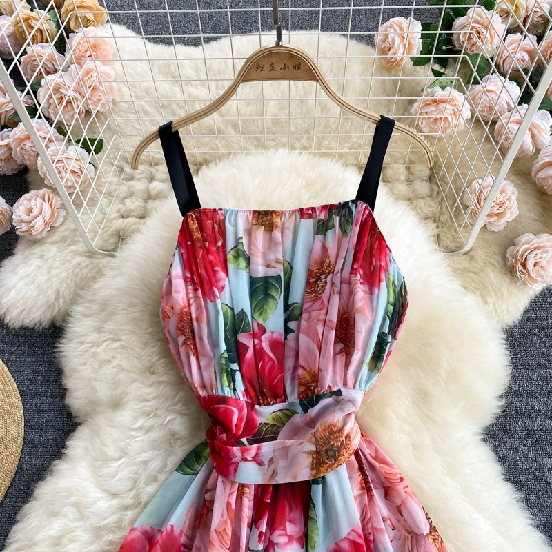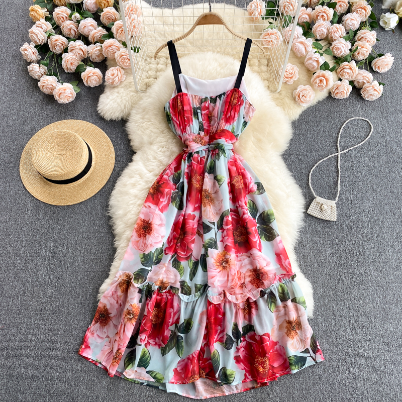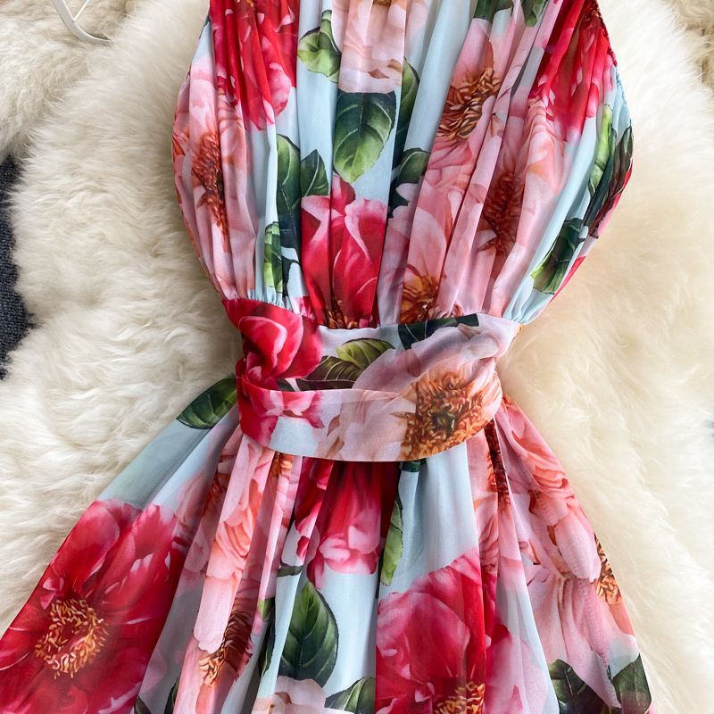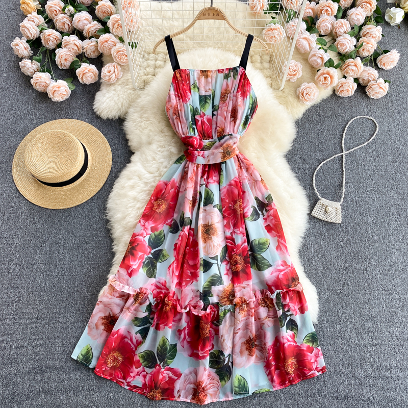 Summer Bohemian Floral Spaghetti Strap Dress Women Sexy Slash Neck Sleeveless High Waist Draped Vestidos Female Robe New