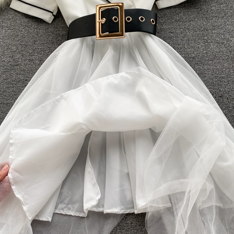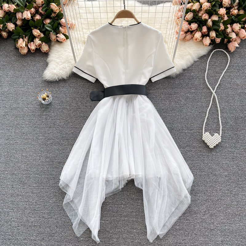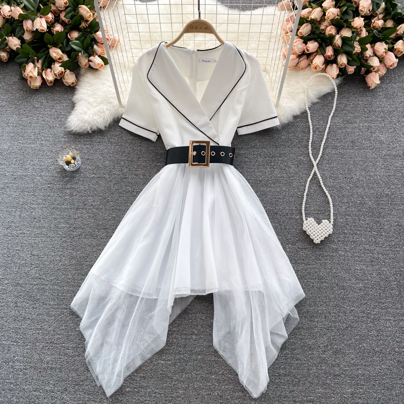 Summer Sexy Irregular Mesh Patchwork Dress Women Vintage Turn-Down Collar Short Sleeve High Waist Vestidos With Sashes New