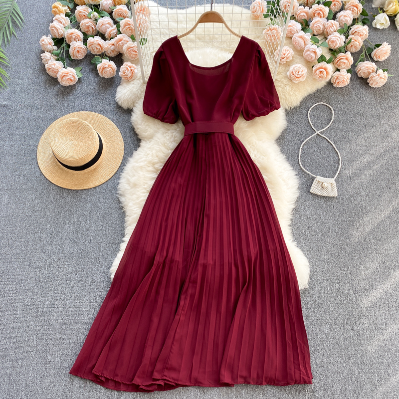 Red/Green/Purple Pleated Long Dress Women Elegant Square Collar High Waist Draped Vestidos With Sashes Female Robe Summer