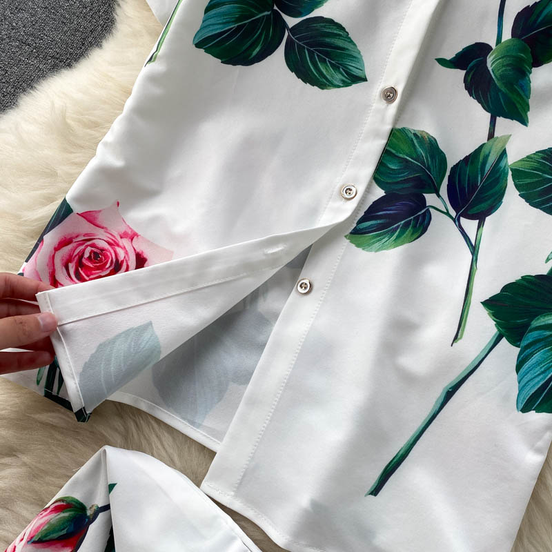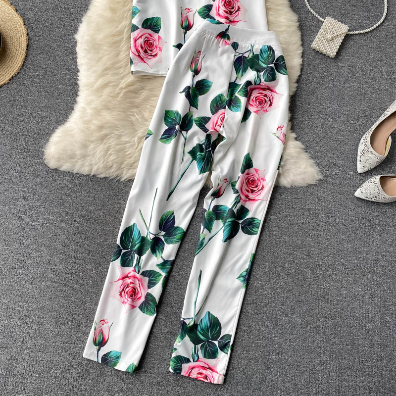 Women Floral Two Piece Set Office Ladies Printed Turn-Down Collar Single Breasted Tops + High Waist Wide Leg Pants Suit New