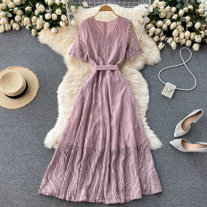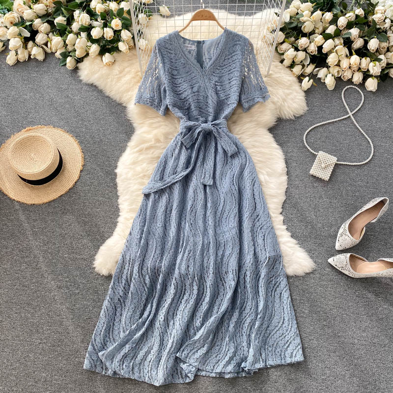 Cheap Dresses, Buy Quality Women’s Clothing Directly from China Suppliers:Vintage Blue/Pink Lace Long Dress Women Summer Elegant V Neck Short Sleeve High Waist Vestidos Casual Party Maxi Robe New