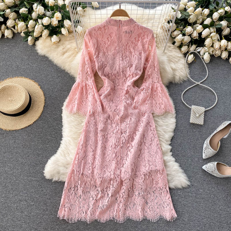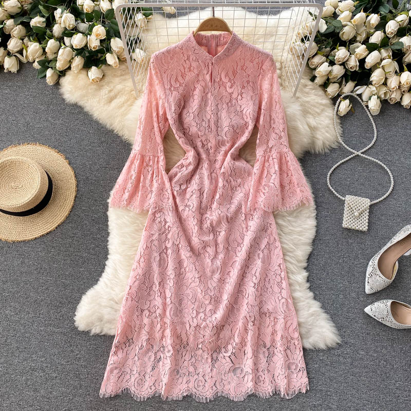 Cheap Dresses, Buy Quality Women’s Clothing Directly from China Suppliers:Vintage Blue/Pink Lace Dress Women Spring Autumn Flare Long Sleeve High Waist Sweet Vestidos Casual Female Robe New Fashion