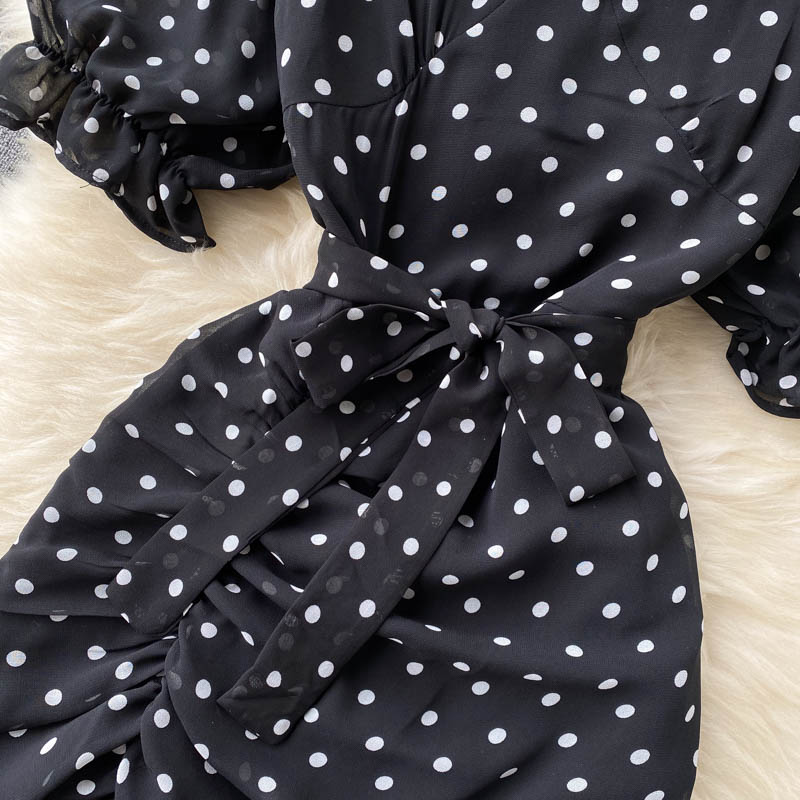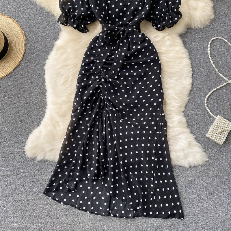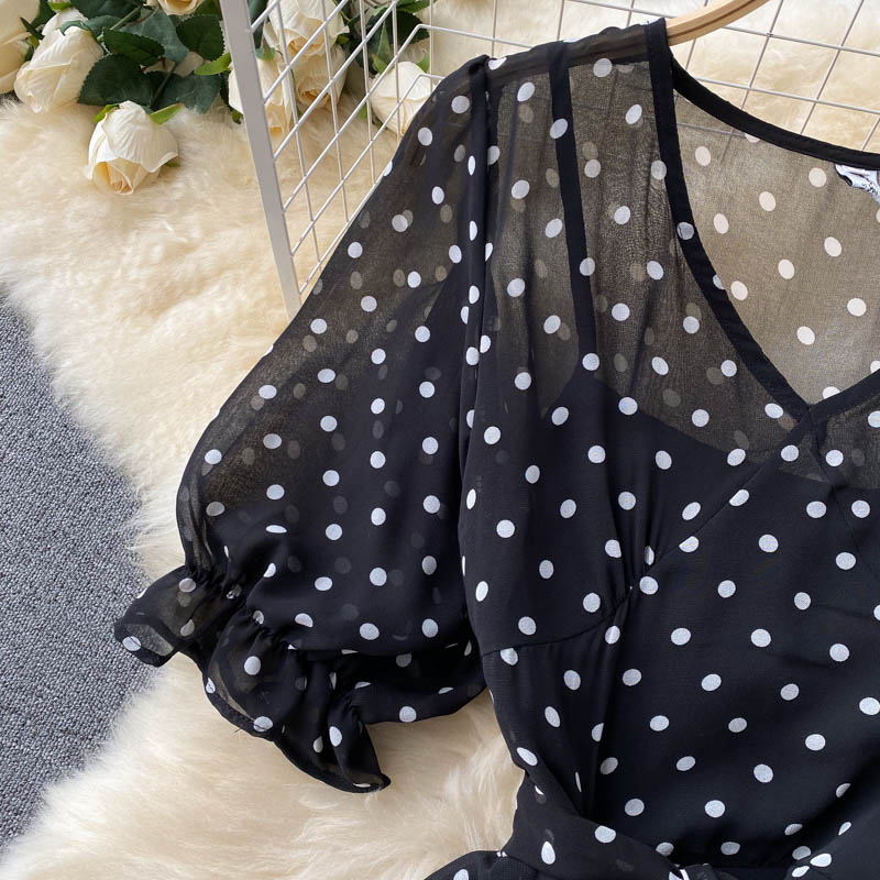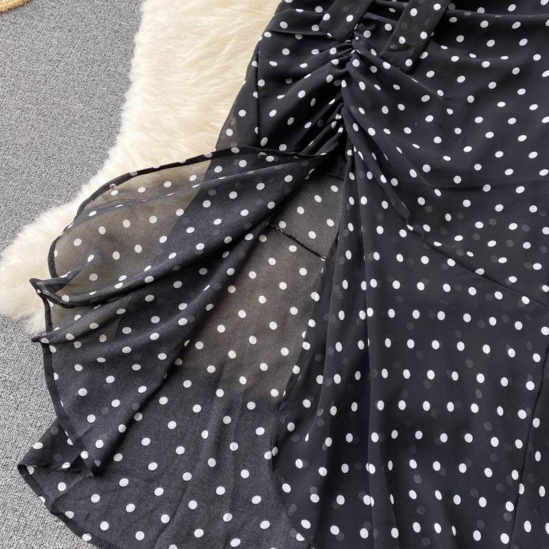 Black Polka Dot Chiffon Long Dress Summer Vintage V-Neck Short Puff Sleeve High Waist Irregular Ruffle Vestidos Female New