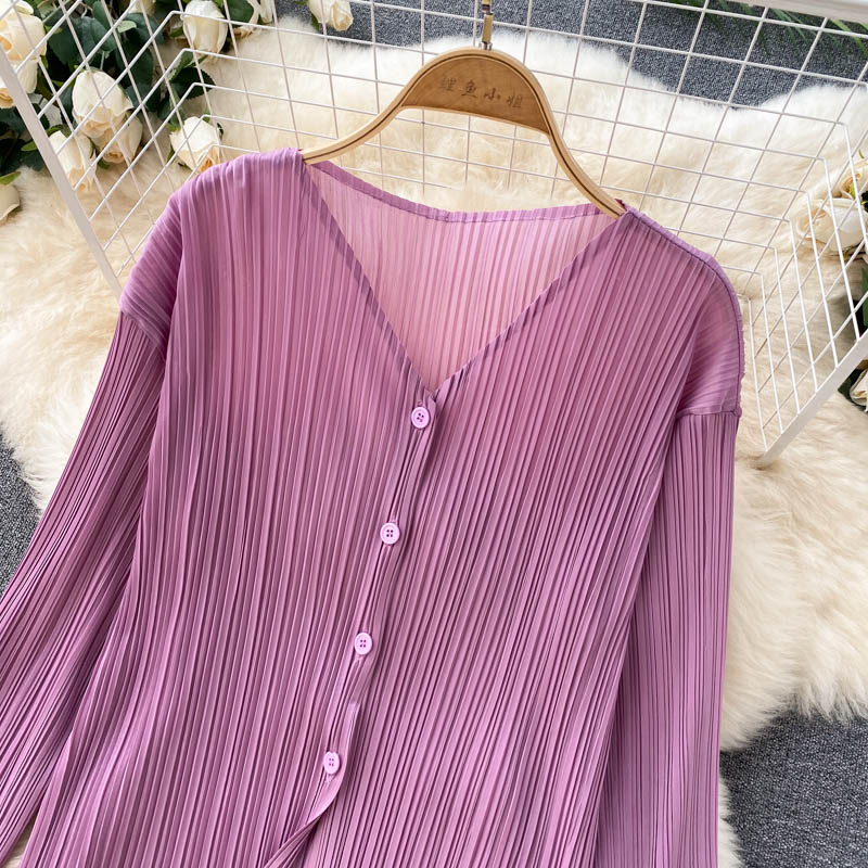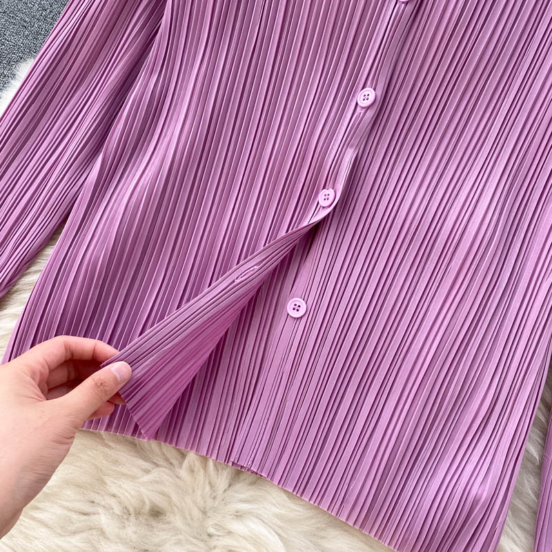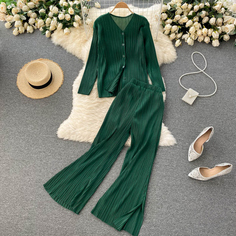 Green/Purple/Brown Draped 2Pcs Set Women Vintage V-Neck Single Breasted Blouse + High Waist Split Wide Leg Pants Pleated Suits