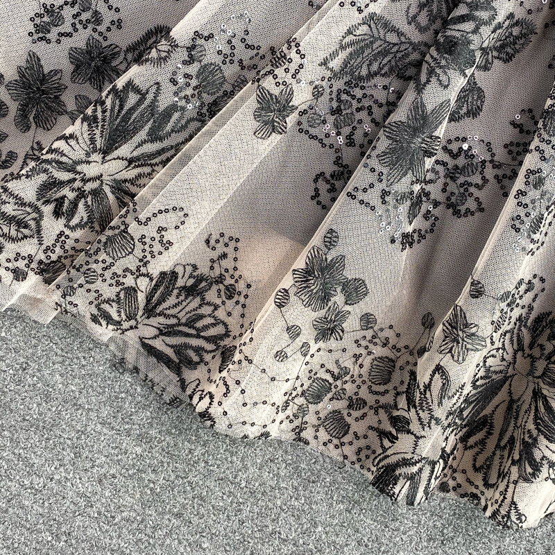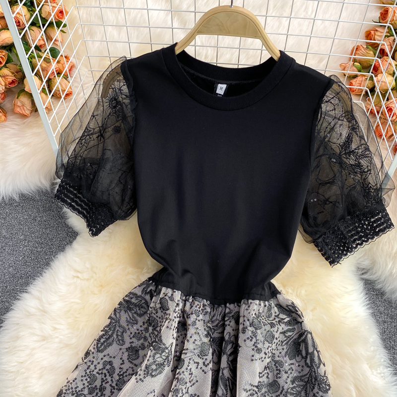 Vintage Black Sequins Embroidered Dress For Women Summer Elegant O-Neck Mesh Patchwork Short Sleeve Party Vestidos Female Robe