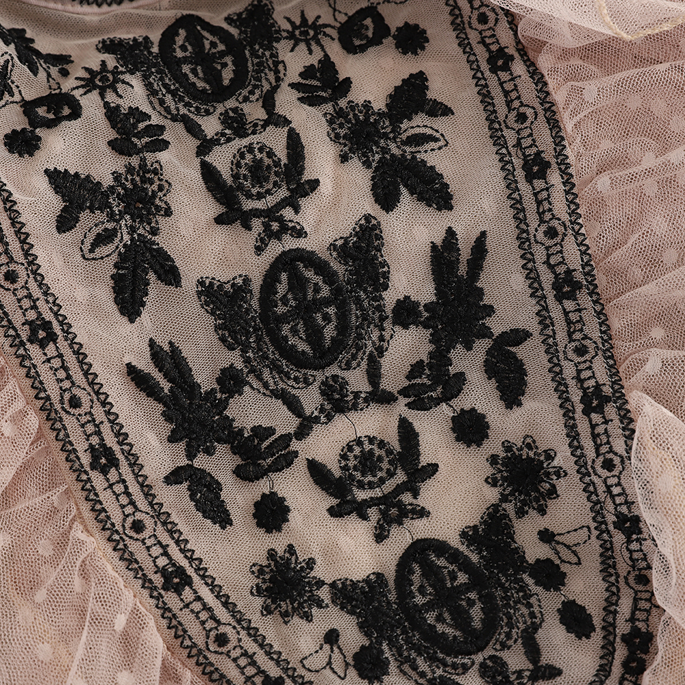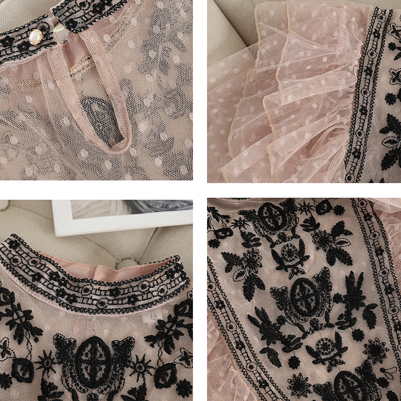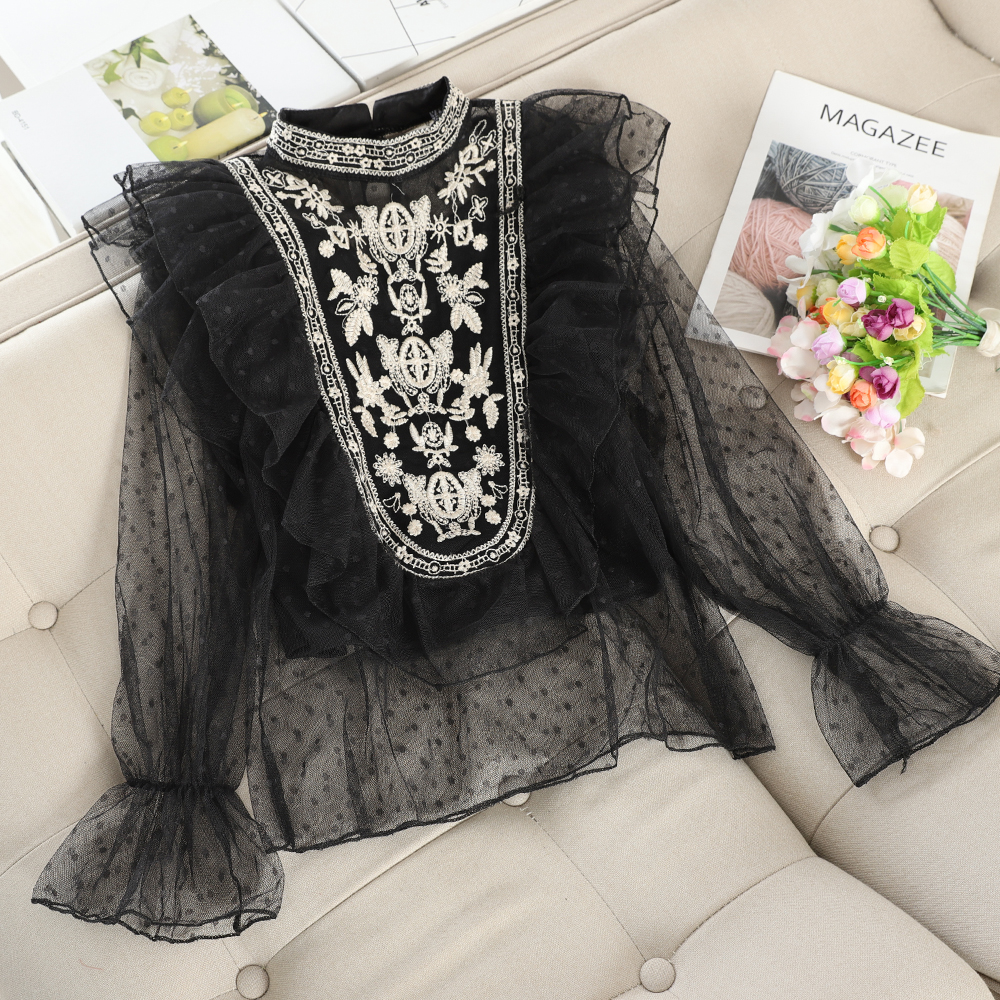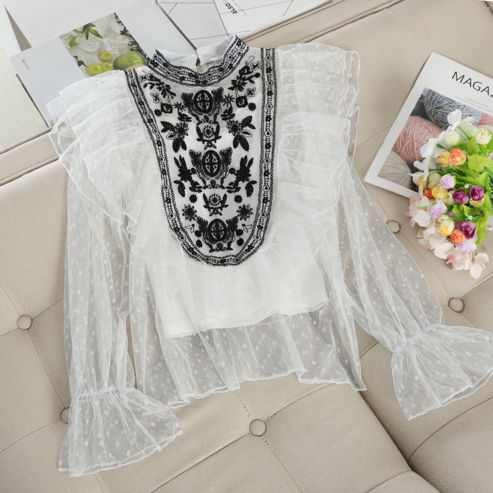 Black/White/Blue Embroidered Mesh Blouse Sweet Loose Flare Long Sleeve Polka Dot Ruffle Shirt Female Casual Blusas Autumn