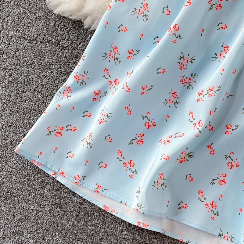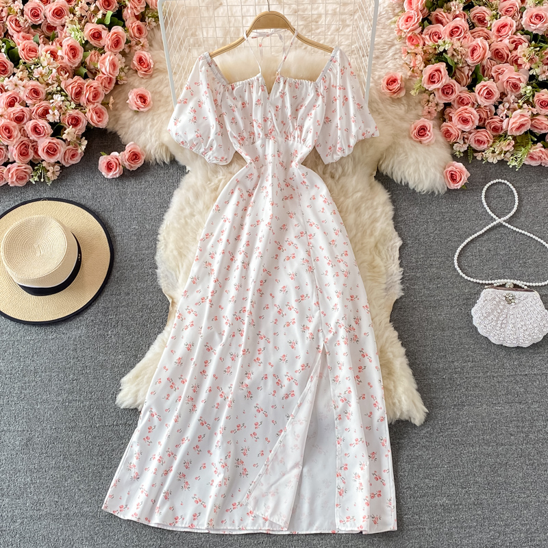 Summer Vintage Floral Long Dress Women Halter Square Collar Puff Short Sleeve High Waist Split Vestidos Casual Maxi Robe