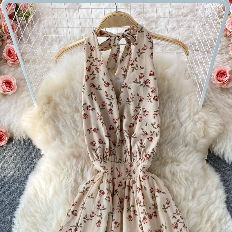 Summer Sexy Halter Sleeveless High Waist Print Knee Length Dress Women Casual Open Back A-Line Vestidos Female Vintage Robe