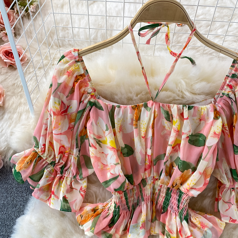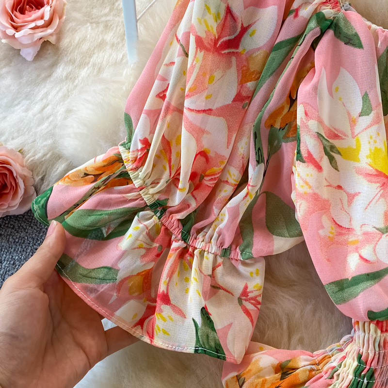 Bohemian Summer Floral Two Piece Set For Women Sexy Square Collar Flare Short Sleeve Tops + Loose Wide Leg Pants Beach Suit