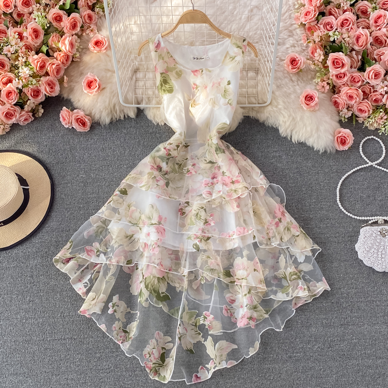 Summer Women Irregular Dress Black/White Round Neck Sleeveless High Waist Ruffle Floral Vacation Party Vestidos Beach Robe